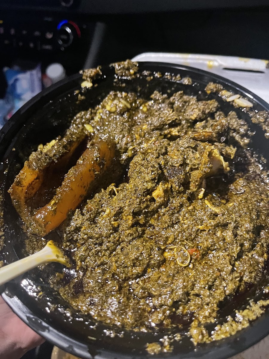 My second time having there cassava leaf. It comes with rice and taste so good. I never had African food before. The spicy level is high but i can handle. It has chicken pieces and i think i think piece of idk what skin or nerve if you know let me know