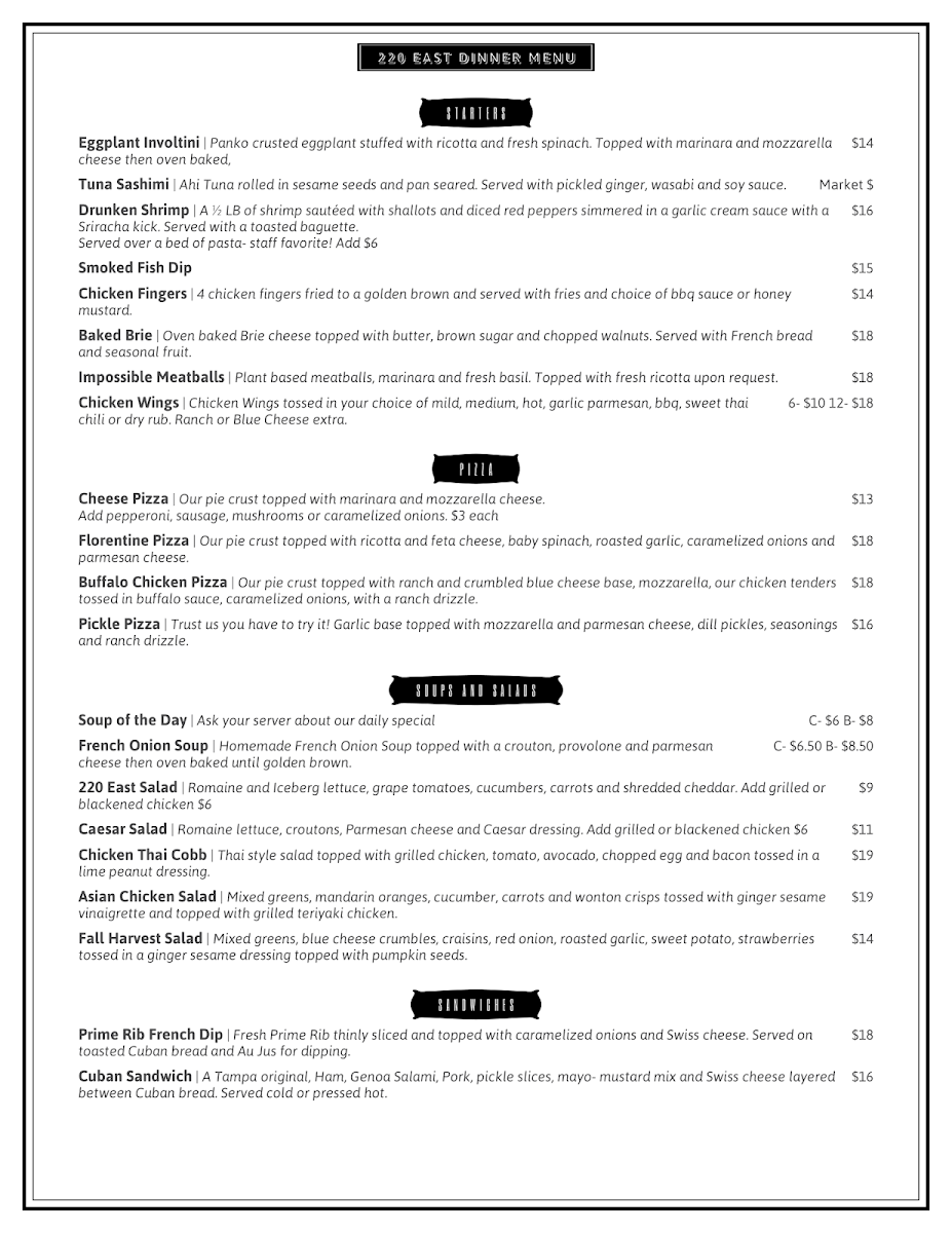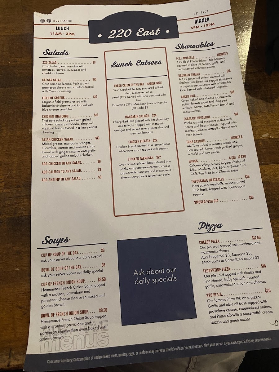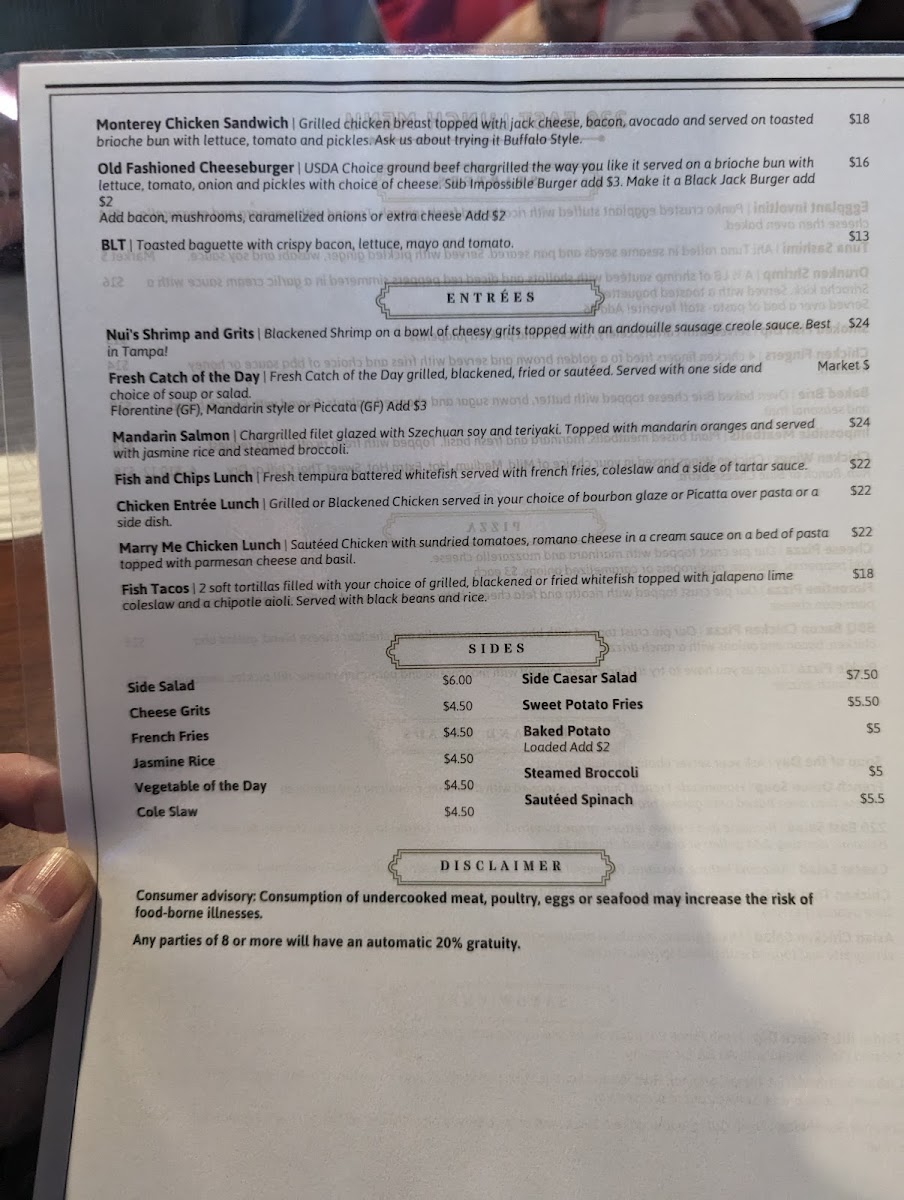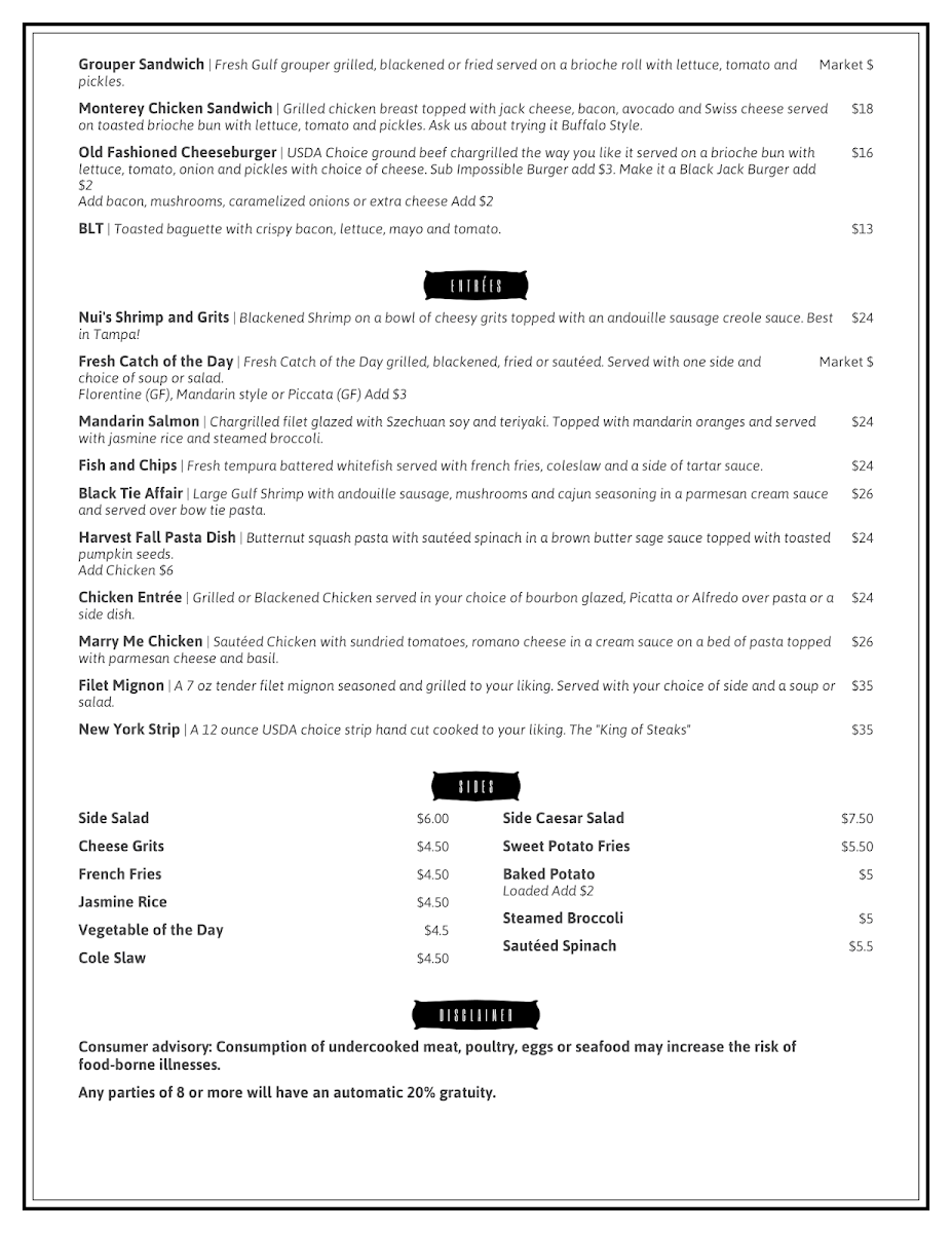 ask your server about today's catch prepared grilled, blackened, sauteed, or fried. almondine, florentine, bourbon, or piccata style add $1.50