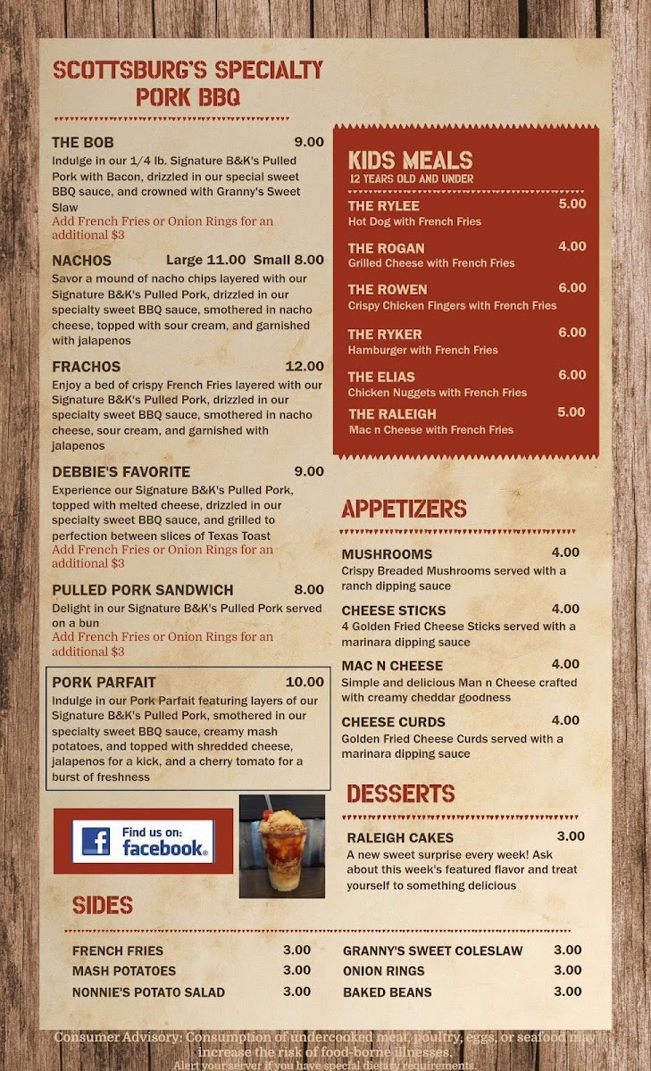 Indulge in our 1/4 lb. Signature B&K's Pulled Pork with Bacon, drizzled in our special sweet BBQ sauce, and crowned with Granny's Sweet Slaw
