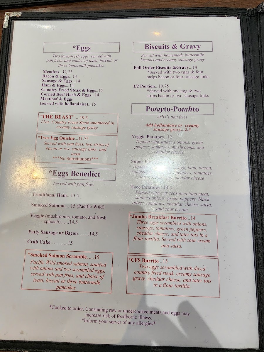 11oz. Country fried steak smothered in our creamy sausage gravy. Served with two eggs any style, arlis's fried potatoes, and choice of toast, english muffin, pancakes, or biscuit