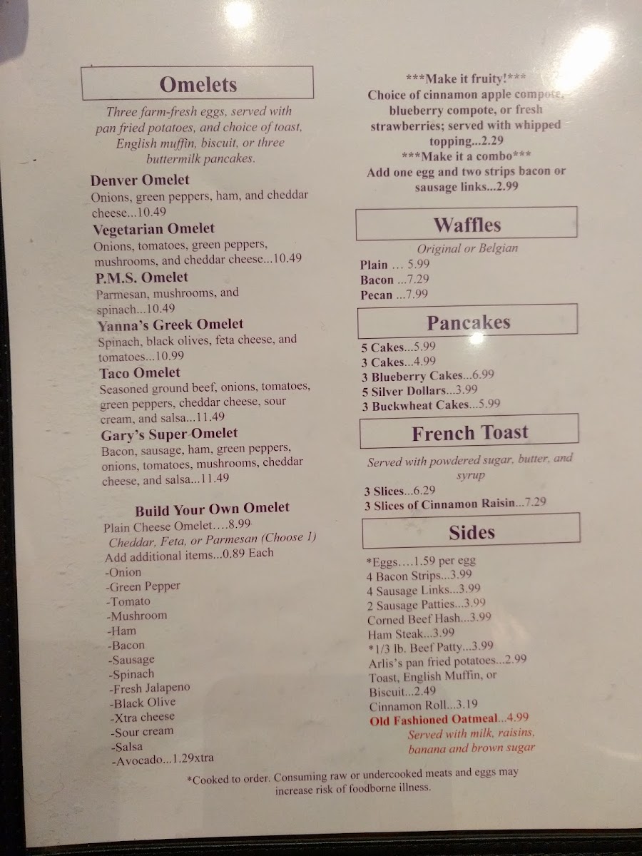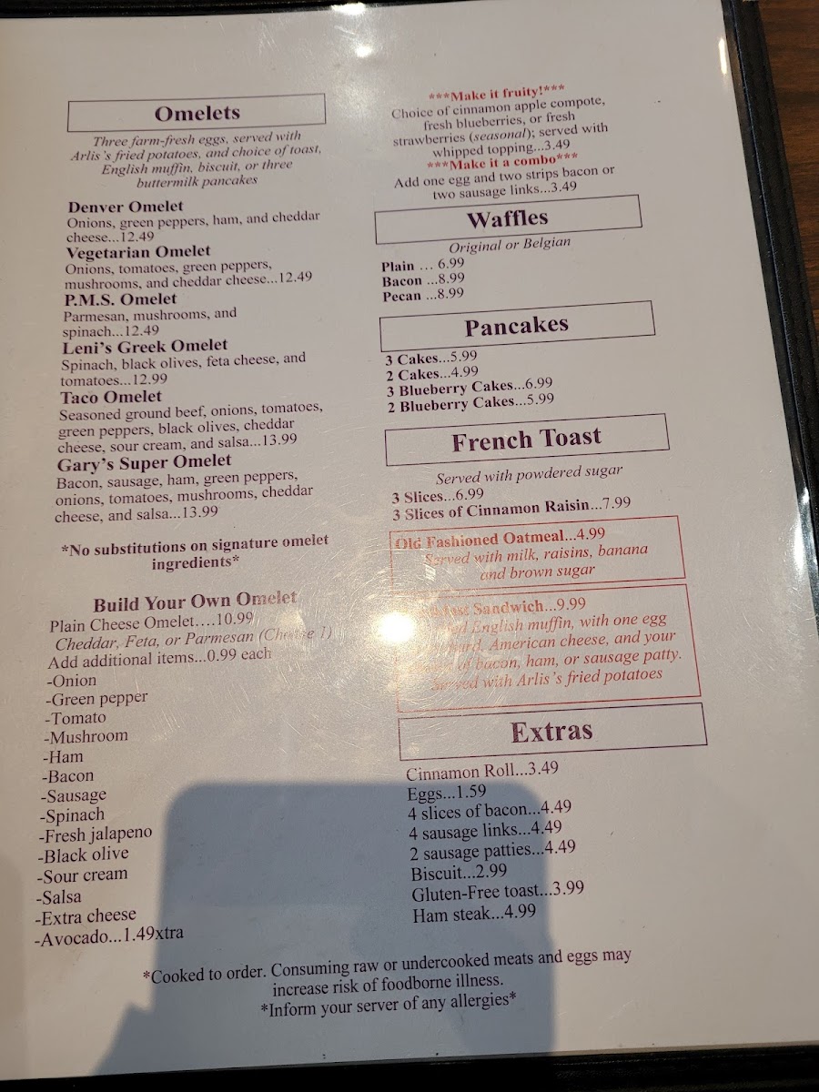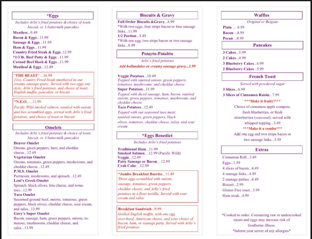 Three eggs scrambled with onions, sausage, tomatoes, green peppers, cheddar cheese, and arlis's fried potatoes in a flour tortilla. Served with sour cream and salsa.
