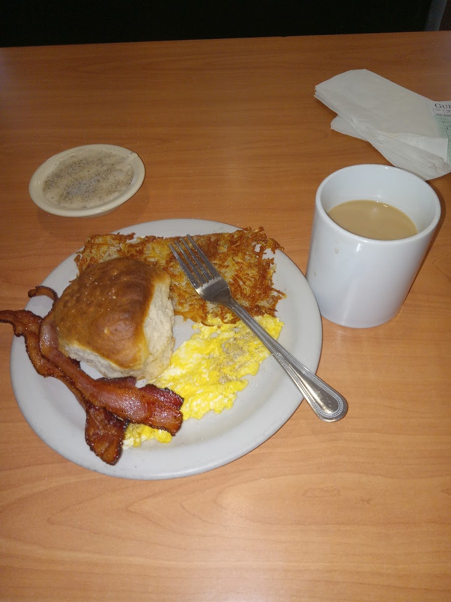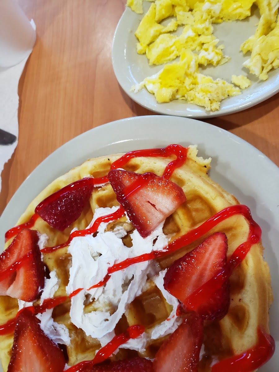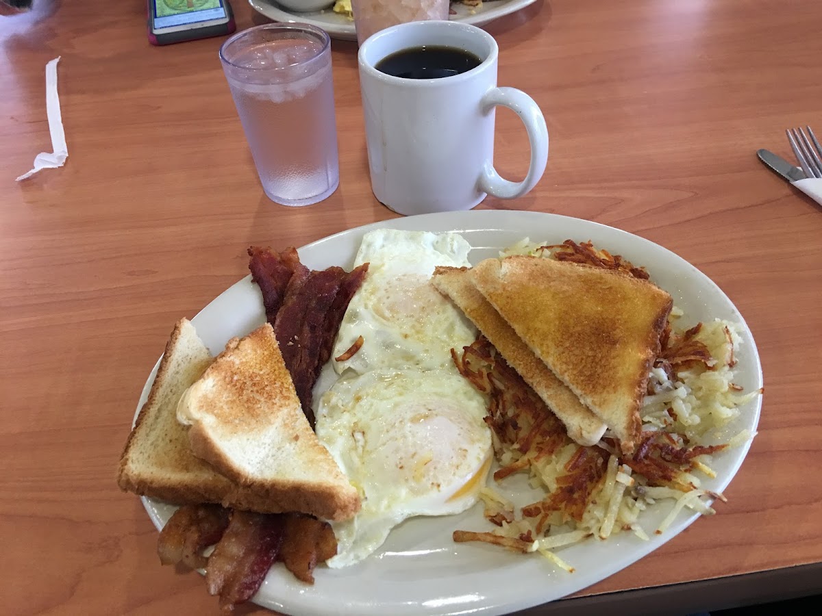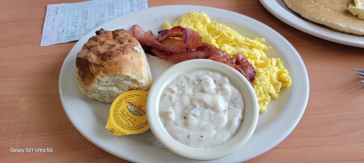 Amazing chicken fried steak. Fun Mickey pancake with whipped cream for our granddaughter. My decaf coffee was never passed half full. Food was delicious. Would definitely recommend that you stop here whenever in the area. They do serve breakfast all day - until their 2 o’clock closing time.