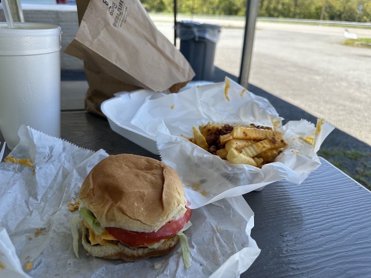 On a motorcycle trip and I stopped for some food. Double cheeseburger and cheese bacon fries were great. Only downer was no bathroom. I had been riding for a while and could have used one.