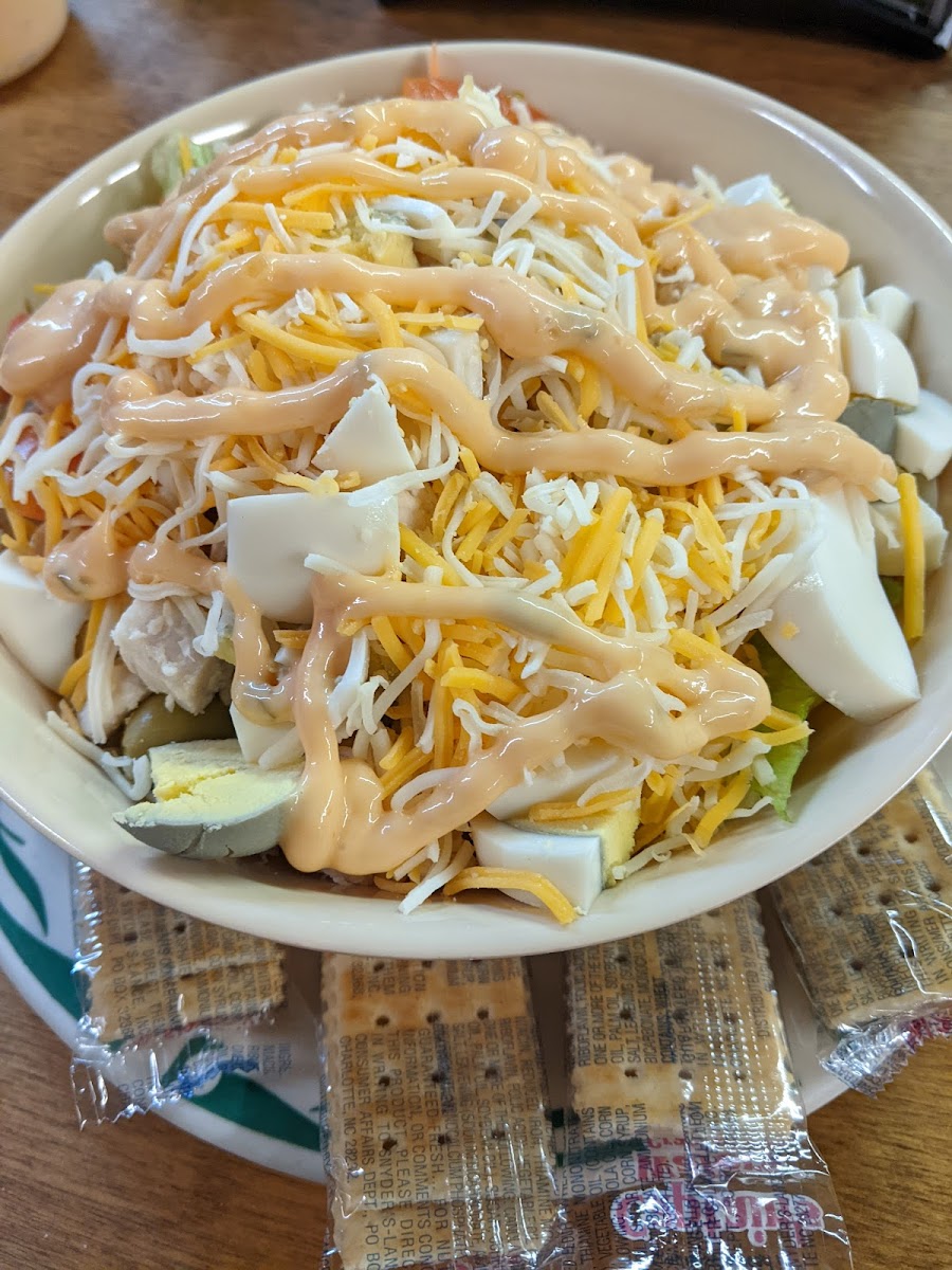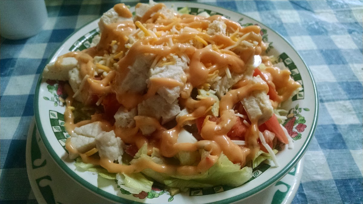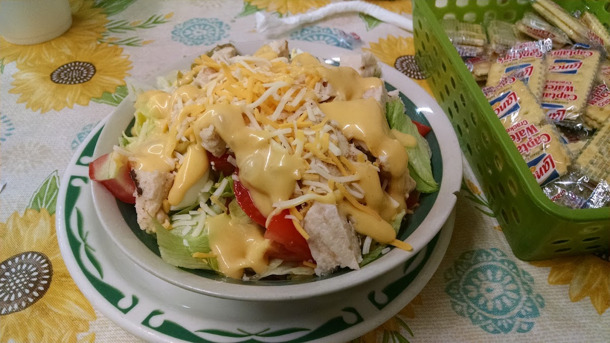 Large chef salad, ham and turkey ranch dressing. Excellent food service and tea. Enjoyed as usual. Good Job! Paul Counce