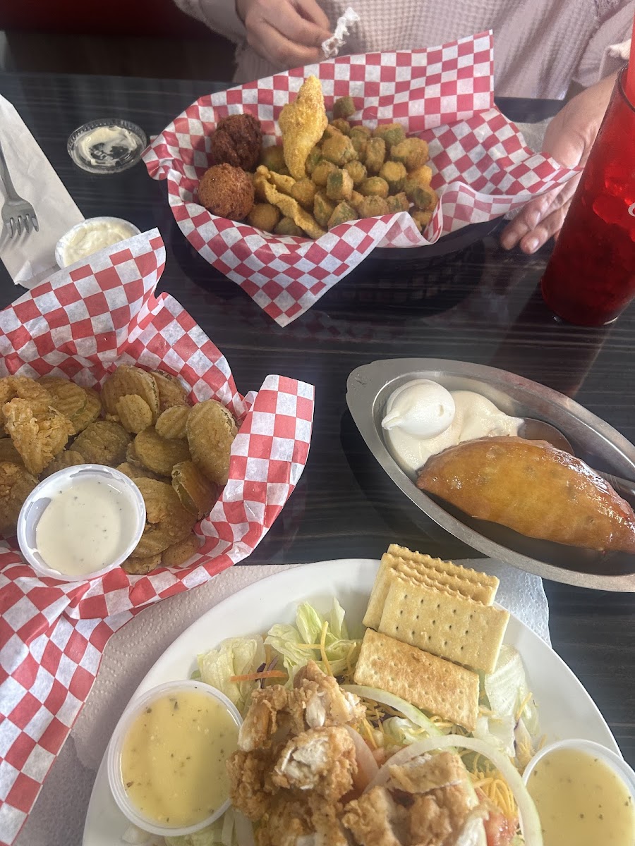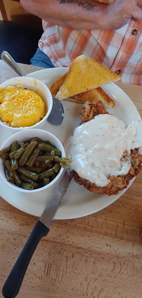I’ve been all over Wichita, Tulsa, and Oklahoma City Can I have to say out of all the restaurants I’ve tried, this one is definitely in my top 10. Not only is the food phenomenal, but the staff is extremely friendly. I absolutely love coming here when I get a chance and I can’t get enough of it. I think that the Catfish is some of the best in the area, and if they do an all you can eat catfish (idk if they do) it’s gonna be my new fish spot. I’ve had a few different chicken items on the menu, and from what I’ve had, it’s awesome. The chicken is hand breaded and seem to be pan fried, with great flavor and texture. Both the chicken strips and chicken fried chicken are safe bets here. Both the white and the brown gravy are awesome, I do something a little different and get a full on my chicken fried chicken and love it. I’d also like to point out that the cheesy garlic mashed potatoes are very unique and worth getting. I usually pair everything up with the tea because their sweet tea mixture has always been spot on. I’ve had a few of their desserts, the fried pies are incredible. The cheesecake is a very generous size, it also has the perfect cheesecake taste and consistency. The something sweeter definitely is something you have to try. I definitely get that and take a cheesecake to go no doubt. And like I said, the staff here is incredible. They’re so friendly and are always very on the ball with their service. It’s a very personable experience and one reason I keep coming back. This is truly a gem of a restaurant in the area, and I highly recommend it to everybody passing through.