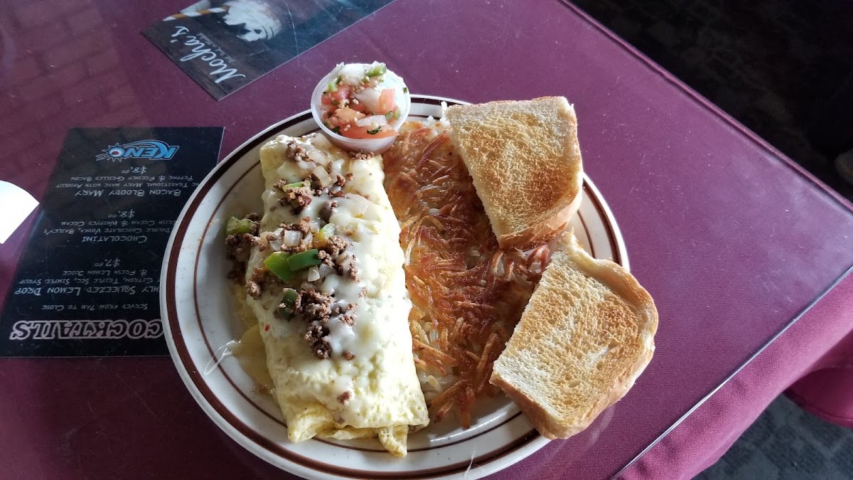 Really nice little restaurant/cafe with a lounge if you prefer. We sat in the lounge area and it was great. They have high tops and low top tables. Video poker in the corner. Very clean and the service was awesome. To top it off they service breakfast, lunch, and dinner all day long so everyone in our group were happy. Highly recommended checking them out if you are in the area.
