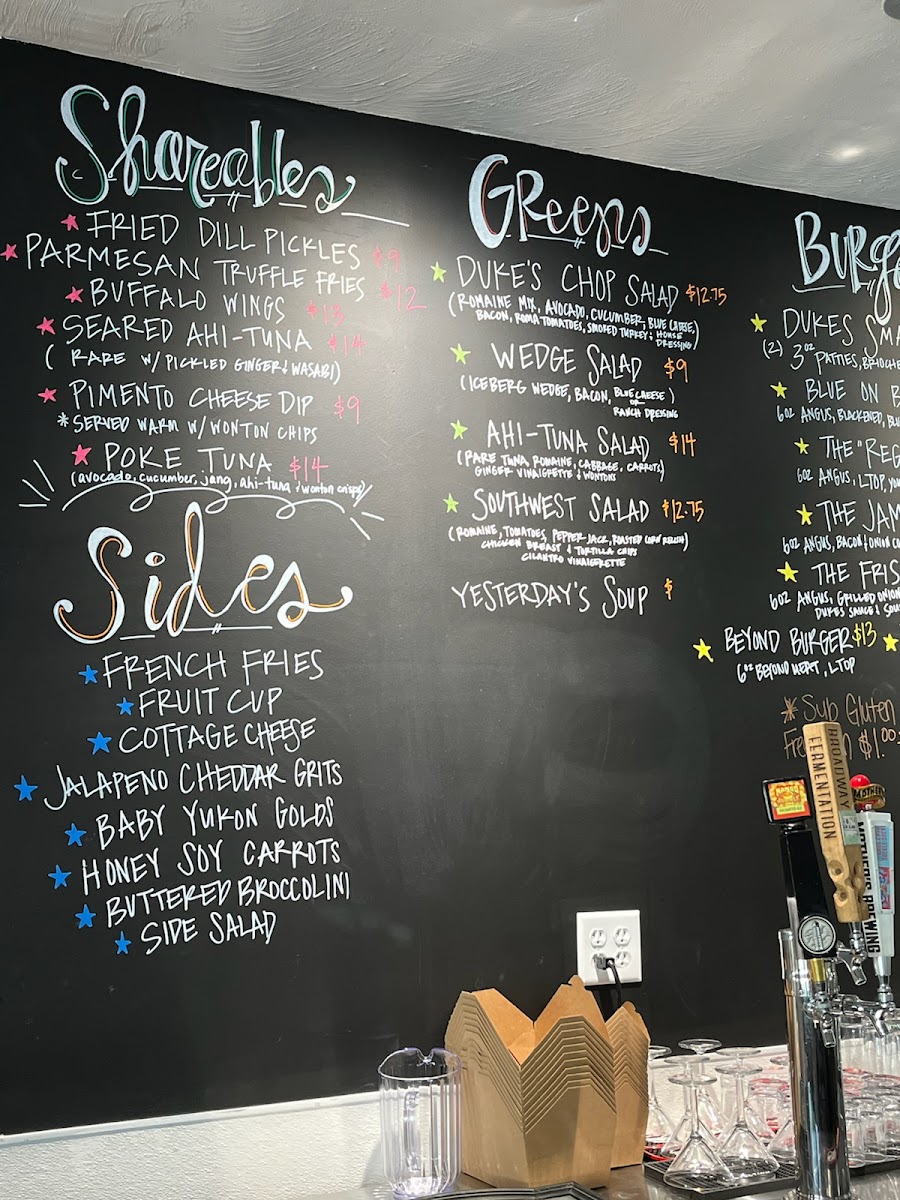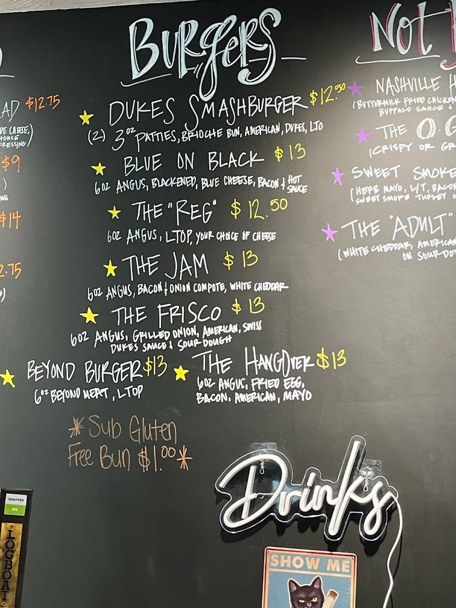 Our Flagship Burger! 2 Smash Burgers on a Toasted Brioche Bun, Dukes Sauce, American Cheese, LTOP served with Choice of 1 side