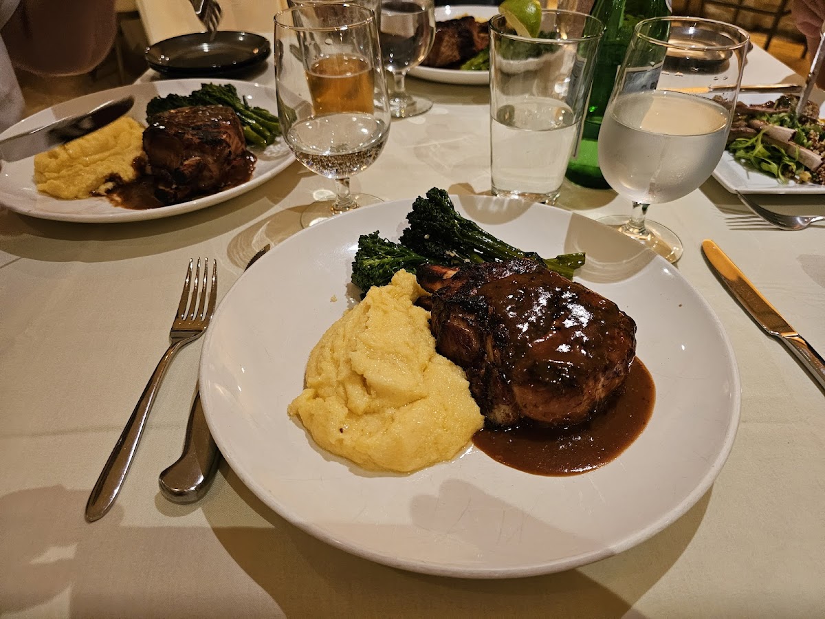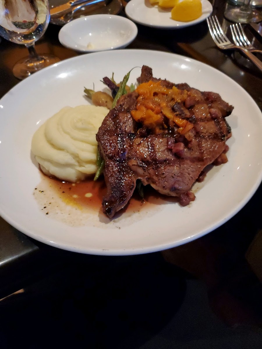 I brought my wife here for our 25th wedding anniversary dinner while we were staying at La Bellasera. I thought since it's in the hotel, it would be nice just to come down and eat without worrying about driving anywhere. Positives: We were seated right away, as I had made reservations in advance. Our waitress was very nice, knew the menu & made suggestions for us, and was very attentive. I went with the chicken and the wife had the pork chops. Both were excellent. We each had a cup of their split pea. Best we've had in a long time. For dessert, my wife had the creme brulee cheese cake, which was comped for our anniversary. Everything was very good. Negatives: Our table was right next to another couple. (Who seemed not so happy to be there ) So that was a little uncomfortable. No partition of any kind. They could use a few more booths, or at least put up some type of dividers. It looked like there was only 1 semi private booth. For looking as being somewhat upscale on their website, there is no dress code for dinner. My wife and I had dressed up, and we're looking good, if i do say so myself. However, others were wearing shorts and t-shirts. Again, feeling a little uncomfortable, like we were over dressed. (I mean, if you're sitting at the bar, then by all means, go casual.) And finally, I thought they'd do a little more for us, considering the occasion. Just like when I made the hotel reservation, I made sure to note the reason for our visit. All in all, dinner was good, the food was delicious and the prices were to be expected.
