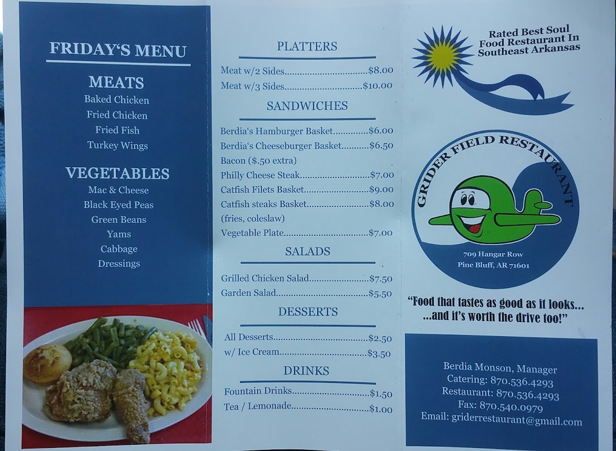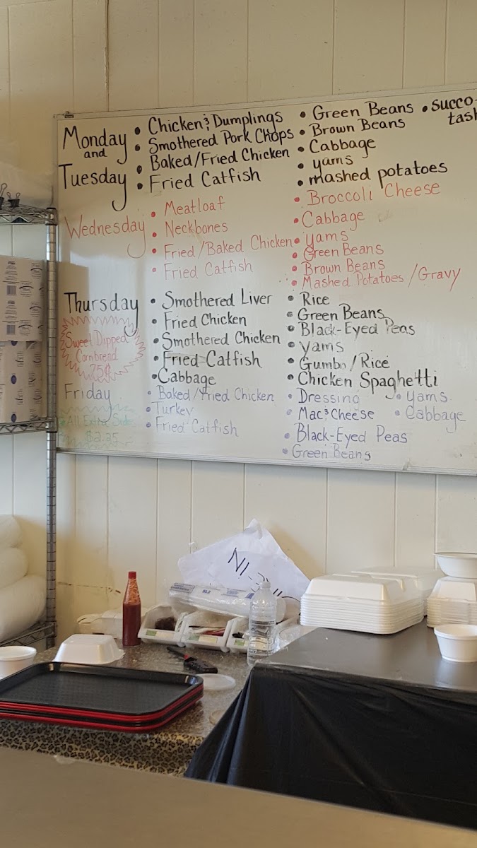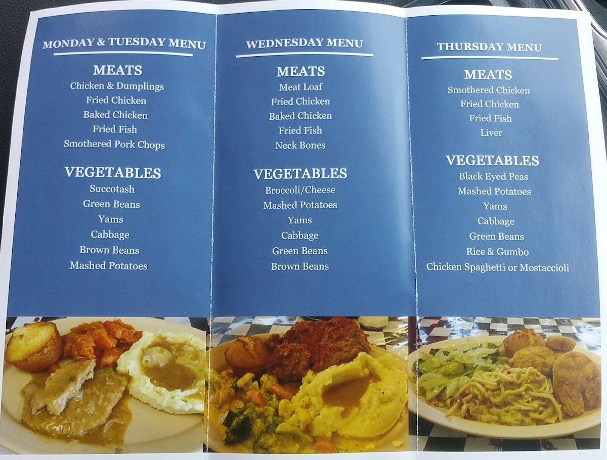 . Choose a meat: Fried Chicken, Baked Chicken, Fried Catfish Steaks, Chicken and Dumplings, Smothered Pork Chops. Choose a first side: Green Beans, Cabbage, Yams, Succotash, Brown Beans. Choose a second side: Green Beans, Cabbage, Yams, Succotash, Brown Beans. Choose a third side: Green Beans, Cabbage, Yams, Succotash, Brown Beans.
