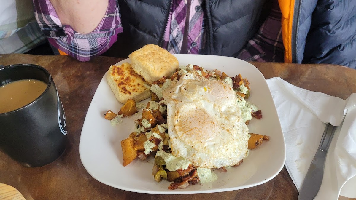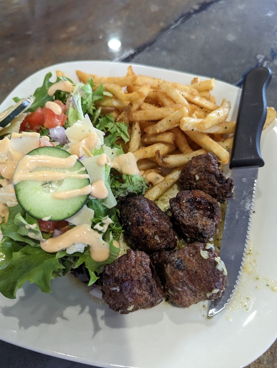 Really cool restaurant with awesome service and wonderful food. The service was above and beyond. They really wanted to make sure I was taken care of and that I was happy with the food but not in an annoying way. For example, they put the dressing on the salad out of the kitchen and the waiter was concerned that it was enough or not. The waiter noticed my fries were not being eaten and took it up on herself to bring some fry sauce. I had steak bites and the meat was marinated and tender. The marinade is subtly sweet compared to bites in other restaurants in town. They have a couple different options for the bites and I got mine with garlic butter. Great place. The sign said they were now doing breakfast too.
