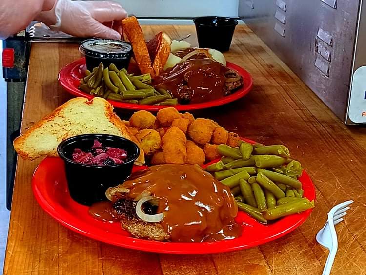 Their food is real and delicious. The country fried steak is good (the small container has peach cobbler). My favorite burger is the cowboy burger.