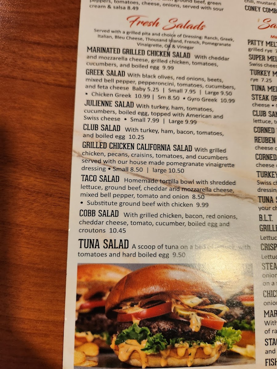 Grilled hamburger patty served on a bed of mixed greens, with a side of cottage cheese, tomato slices, boiled egg, and your choice of peaches or pineapple with grilled pita bread.
