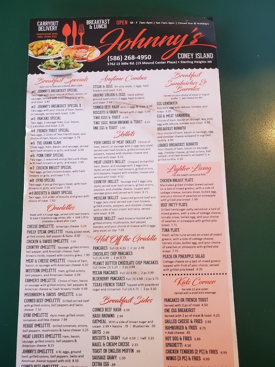 Choice of ham, bacon, or sausage with 3 eggs (any style) served over hash browns, grilled onions and peppers, topped with cheddar cheese served with toast.