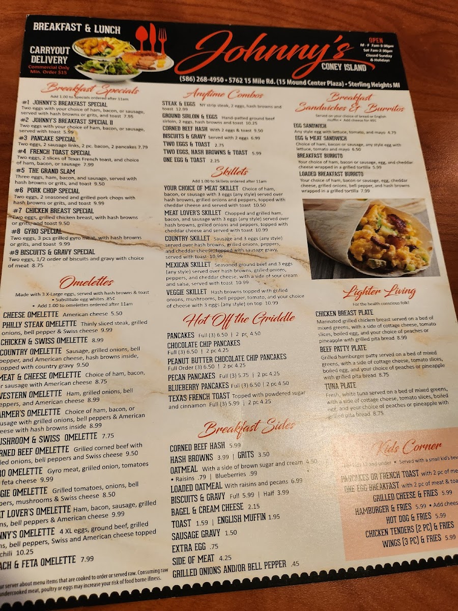 Seasoned ground beef and 3 eggs (any style) served over hash browns, grilled onions, peppers, and cheddar cheese, served with toast.