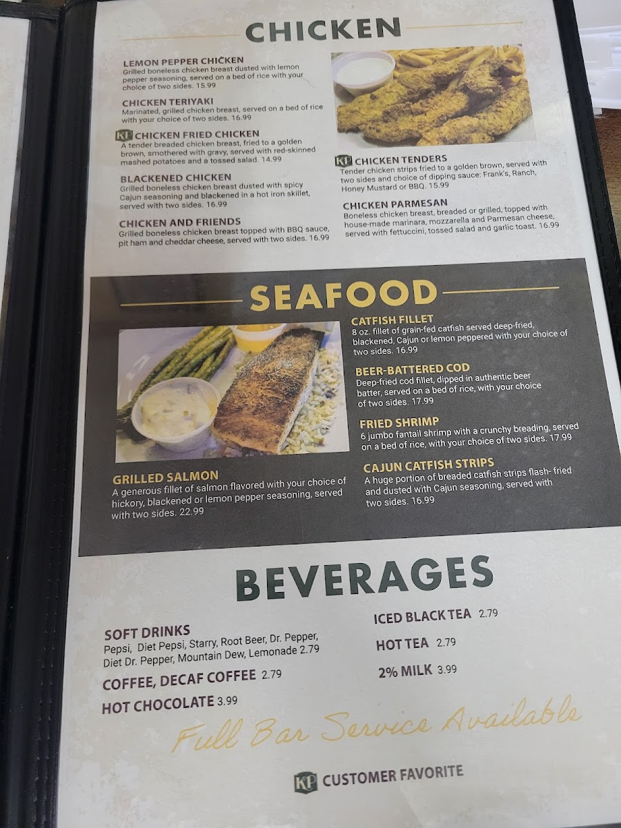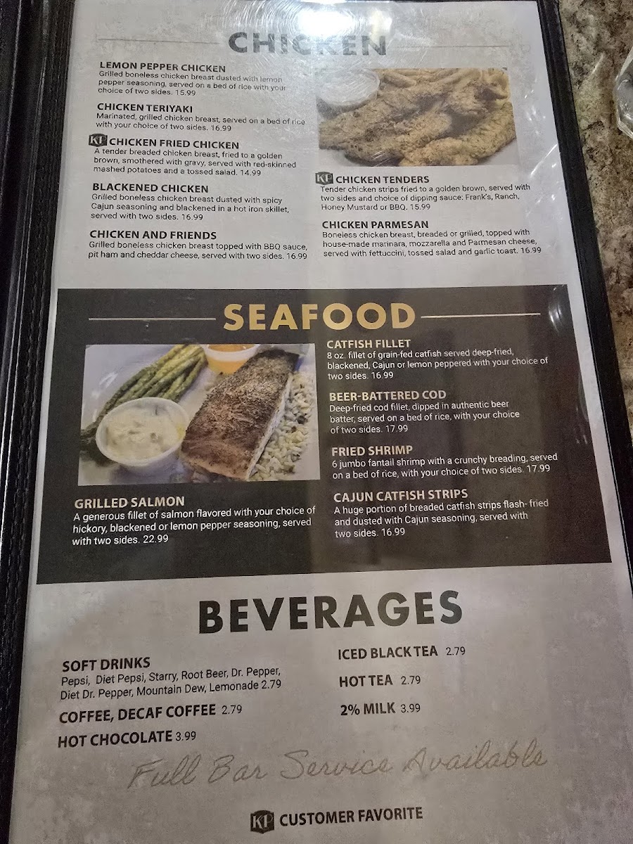 8-oz fillet of grain-fed catfish served deep-fried, blackened, cajun or lemon peppered with choice of two sides.