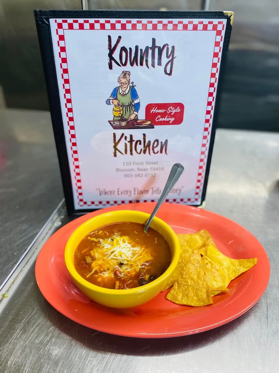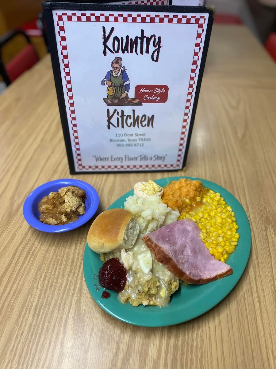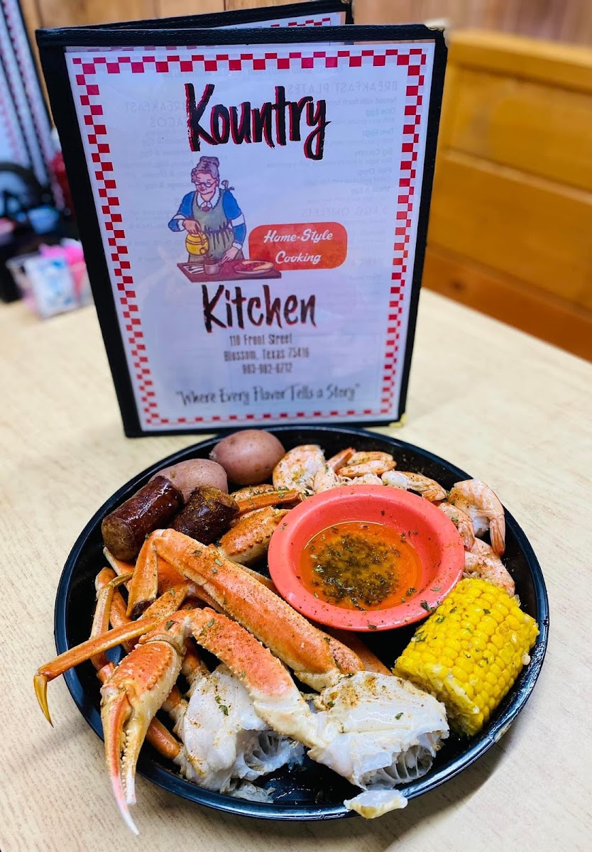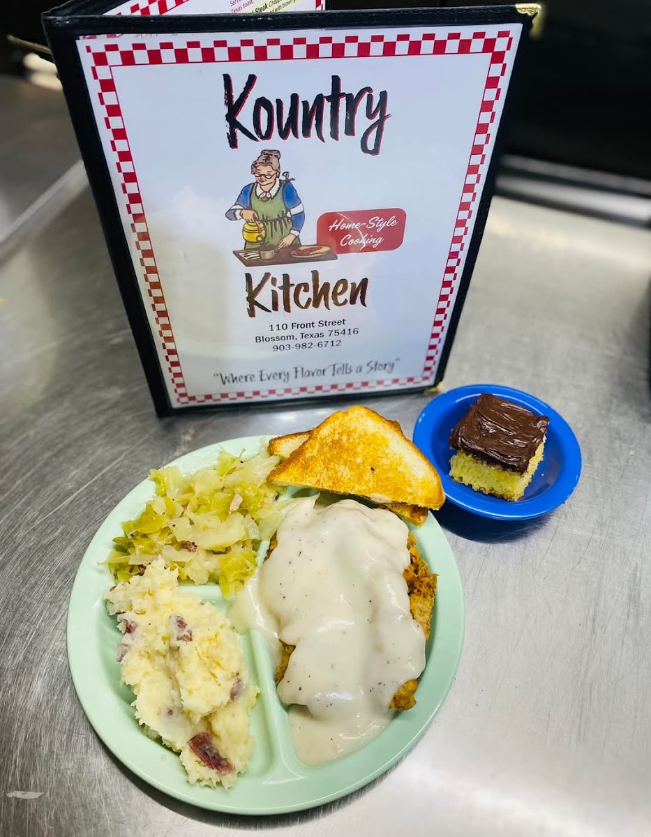 Kountry Kitchen is an American restaurant located at 110 Front St, Blossom, TX 75416, United States. It has 123 user reviews. The restaurant mostly avoids wait times except on Saturday evenings from 5:00 PM to 7:00 PM, where a wait of up to 15 minutes may be seen. Featured dishes include Shrimp & Sausage Boil, Eggs Sausage Hash Browns Toast Plate, Ham Chicken and Dressing Plate, Chicken Enchilada Soup, and Chicken Fried Steak Plate, showcasing a range of classic American comfort foods that highlight hearty and varied options for diners.