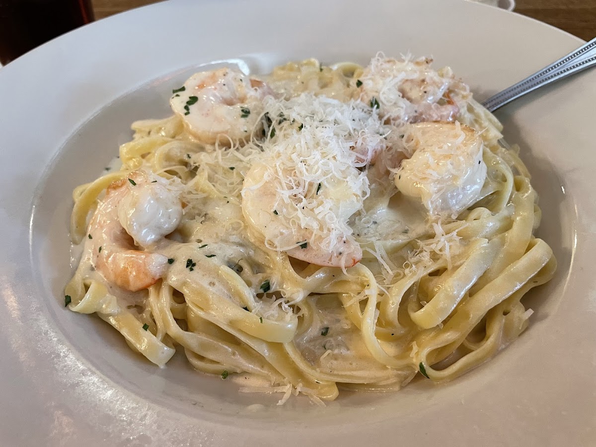 The food was amazing, I had the cream of crab soup, rolls, and shrimp Fettuccine Alfredo and a soda. I was very impressed with the shrimp they were cooked well and very thick in size and tasted very flavorful. The service was excellent I was greeted at the door and seated right away. The waitress was very kind and very attentive to me the entire time I was there. The cost was very reasonable. I will definitely be returning very soon!