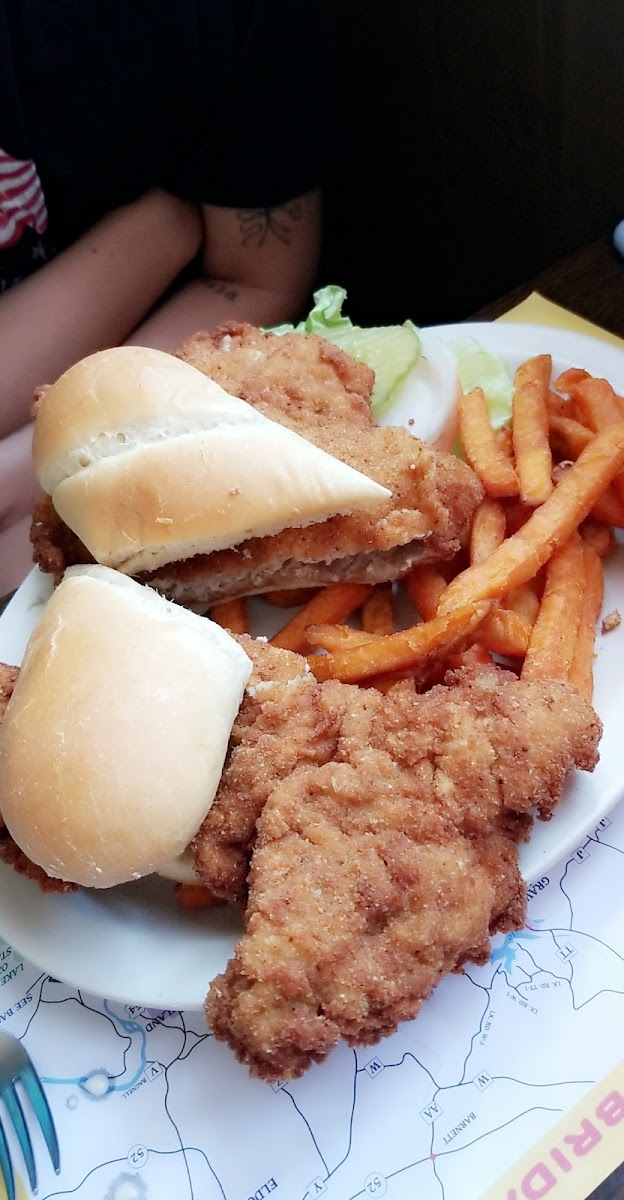 Little Vinny's offers delicious traditional American fare in a casual atmosphere, including a salad bar. The service is fast and friendly, and you can watch your favorite sports teams on one of several large-screen tvs, from either at the spacious bar or while seated at a table. I highly recommend the savory grilled chicken sandwich, pictured below, and the battered onion rings are scrumptious! Also pictured are the chicken schnitzel, (gravy-smothered) and the fried chicken with mashed potatoes and green beans. I gave 4 stars because the menu lacked a variety of vegetable sides and vegetarian options, other than salad bar. That's my two cents. Otherwise it was a pleasant dining experience.