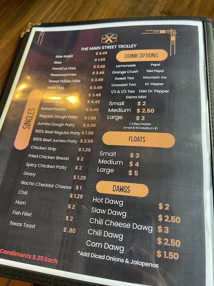 Try our signature dough burger just like pawpaw made in the 80's! Trolley's come dressed with mayo. Mustard, ketchup, onions, tomatoes, pickles, and lettuce. Specify how you'd like it dressed.