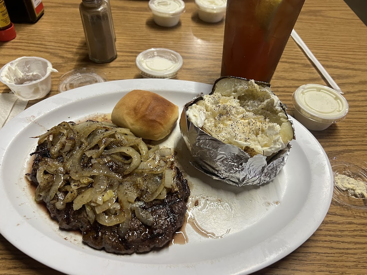 Terrific night out at this out-of-the-way spot , but since we live kinda out there too it was just a drive through the woods for us . Well worth a trip from wherever you live . Nice homey atmosphere and friendly folks . Our server was great and all the servers worked as a team. The busser was passing out samples of her delicious pecan brittle . There was a guy playing guitar and singing . My wife enjoyed her wings and sweet potato fries . As for me … well the prime rib was the best I’ve had in many years , maybe the best I’ve ever had . The meat was tender and the bark and au jus so flavorful. This is definitely going in regular rotation .
