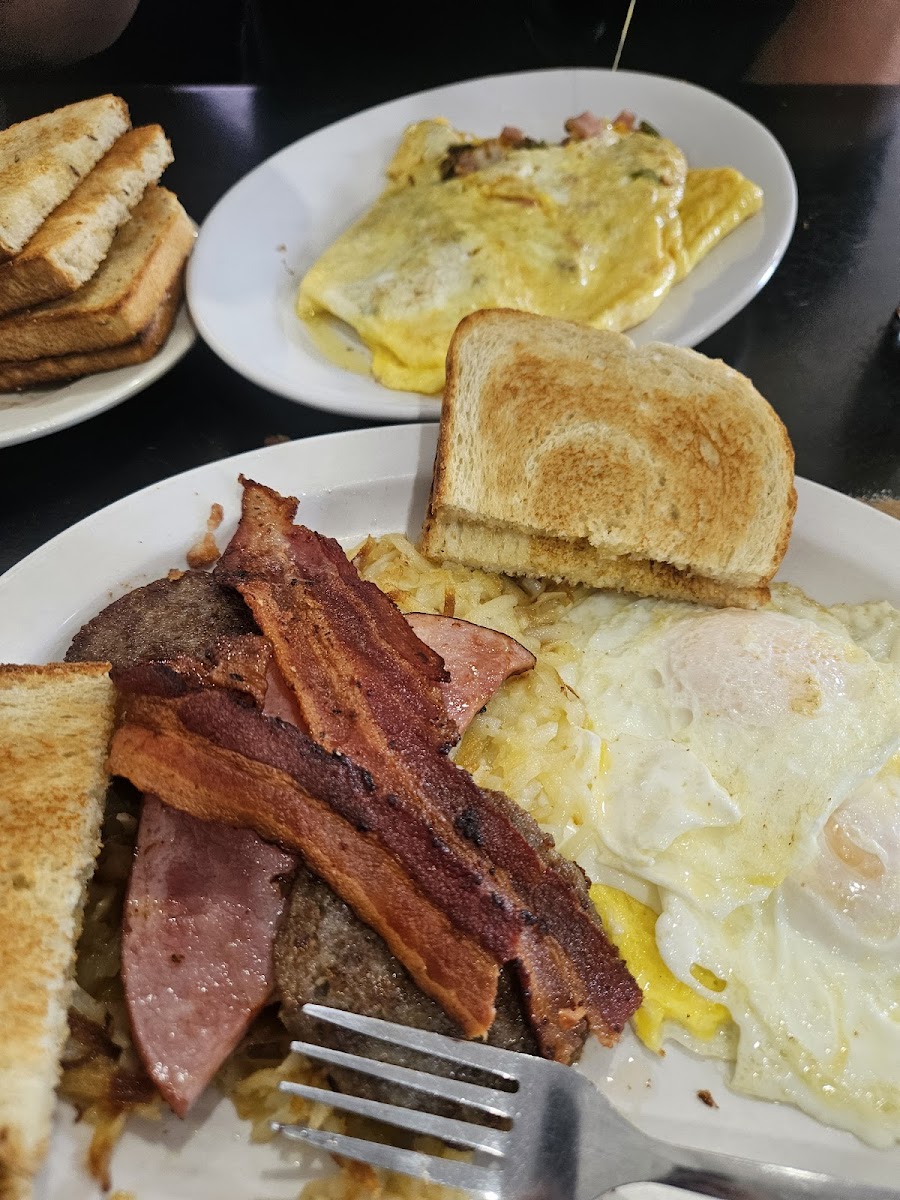 Our breakfast was delicious. Good sized portions for the price. Coffee was okay. Bathrooms were clean. Super friendly wait staff. This place was just what we were looking for. Thank you for the wonderful food and service. Would def eat here again!