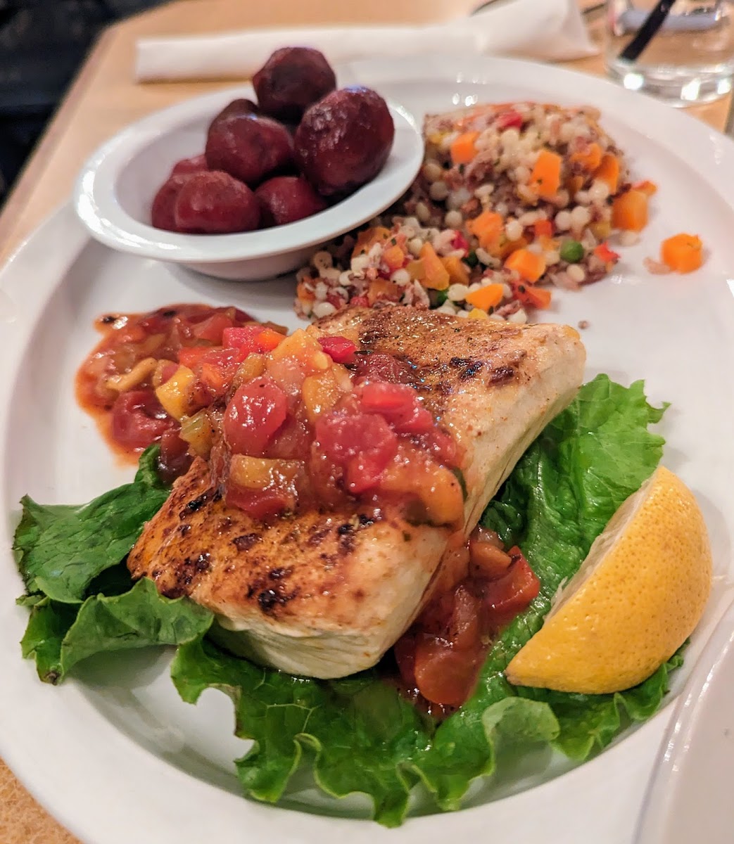 Tired, hungry, and 250 miles from home, we picked a place to eat at random. They were busy on a Wednesday evening so we thought that was a good sign. I ordered the chicken Santa Fe and my wife got fish. The chicken is a pasta dish in a mild jalapeno sauce. It was good but the sauce just tastes of cheese. I couldn't discern any jalapeno flavor at all. There's not much chicken in the Chicken Santa Fe and it needed a little salt but it was a large portion and the sun dried tomatoes were very flavoring The fish dish was a special. It was seasoned well but a little over cooked. She asked for couscous and beets on the side. Both sides were delicious. The service was fast and friendly. Pop-country music playing in the dining area was too loud to comfortably converse, though.