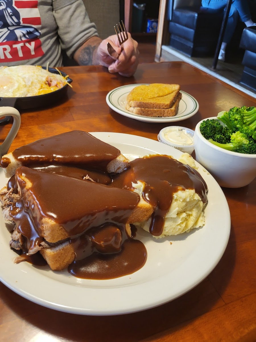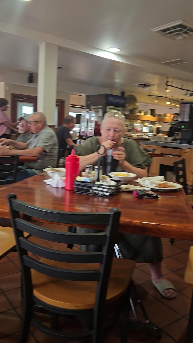 Great local establishment that has great breakfasts. The staff has always been pleasant even when they are super busy. Their pancakes are amazing and their French toast even better. They have pizza as well and a salad bar. They also have a Sunday brunch buffet. Prices are reasonable. Right off the highway for easy on and off. Clean bathrooms.