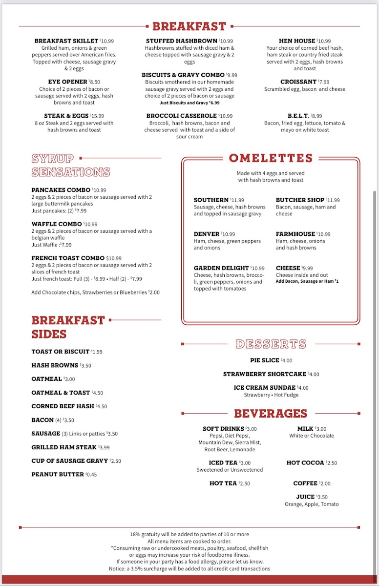 2 biscuits smothered in our homemade sausage gravy served with 2 eggs and choice of 2 pieces of bacon or sausage.
