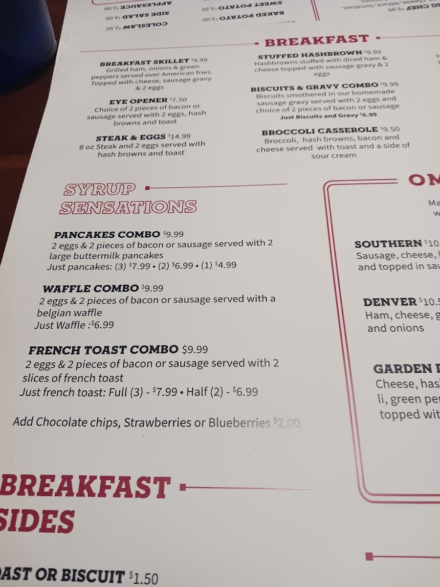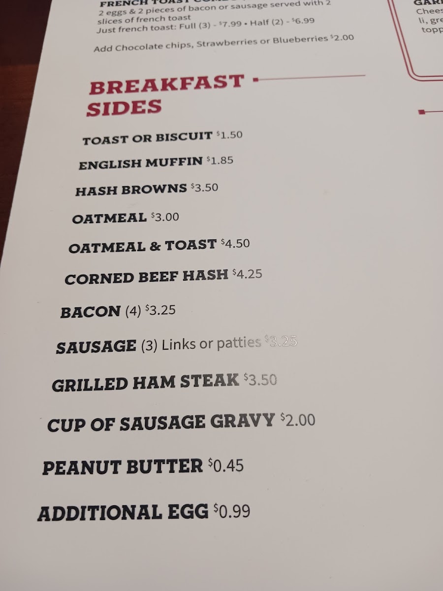 Cheese inside and out. Add bacon, sausage or ham for an additional charge.