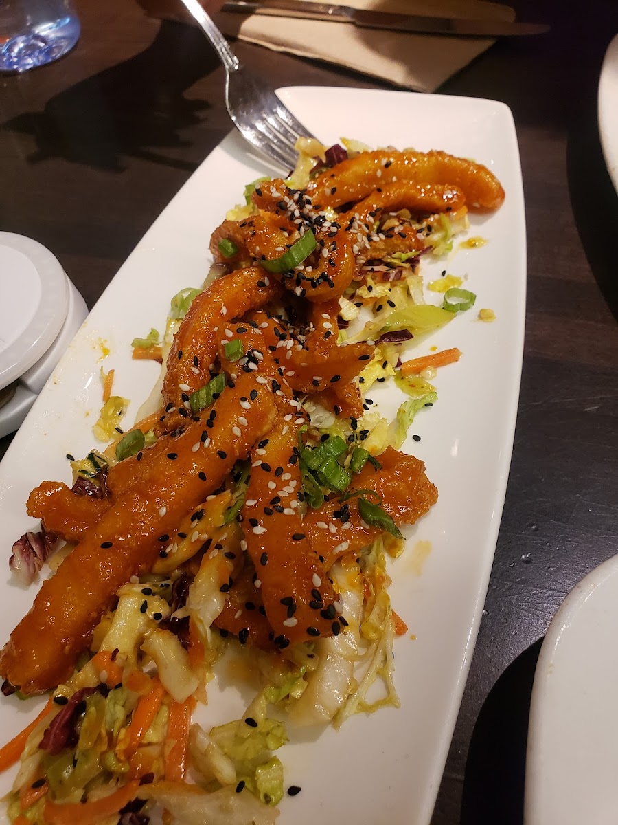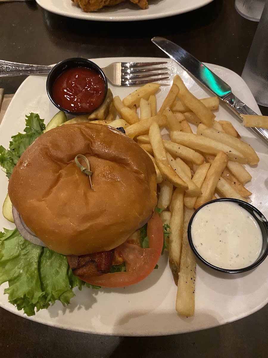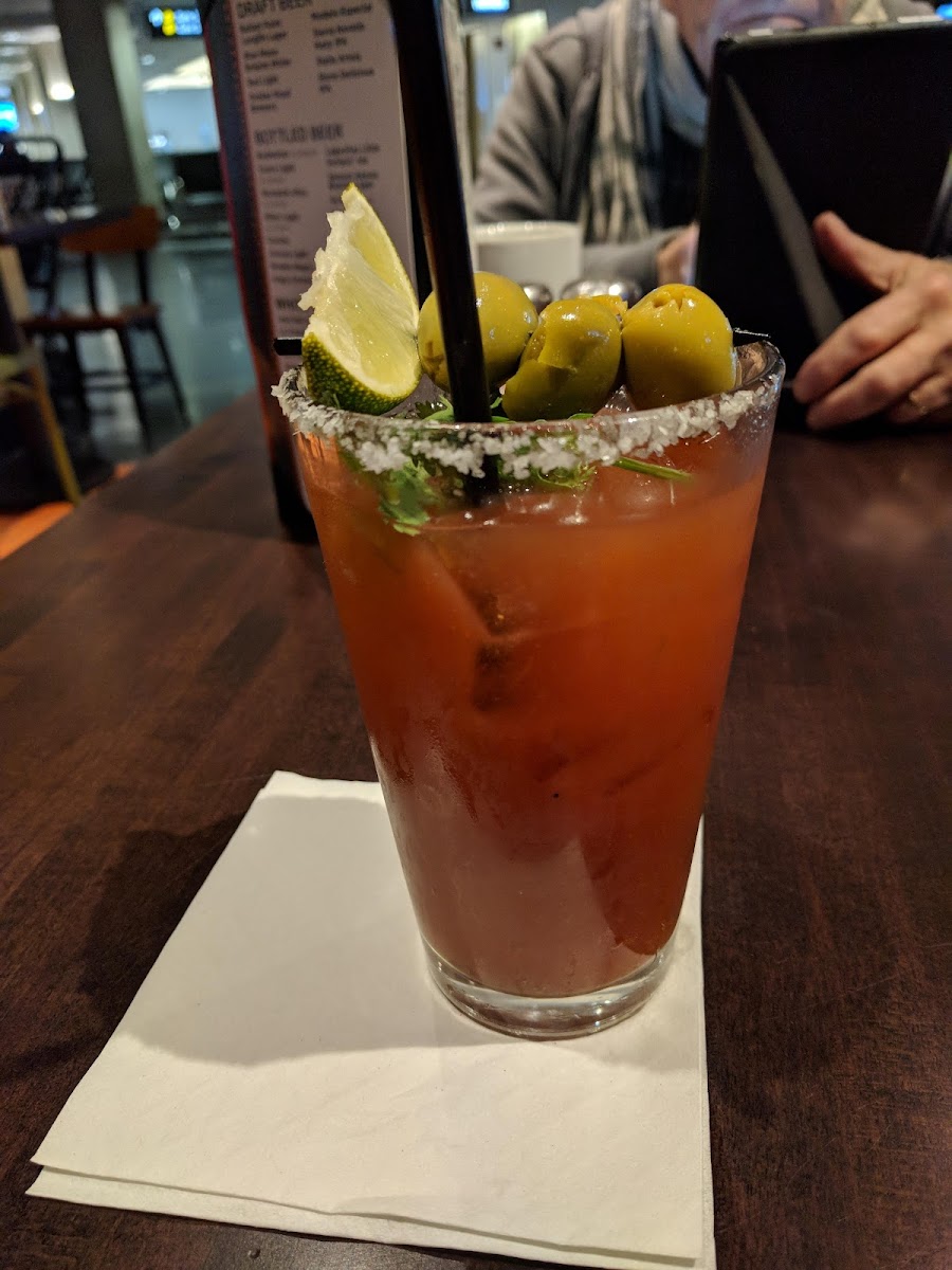 Super friendly server, amazing burger. Cooked to perfection, seasoned well, lettuce crisp, tomato fresh. Music not too loud. Love the long, communal table near the kitchen. Good value for an upscale restaurant at an airport. The place was jammed but service was not compromised.