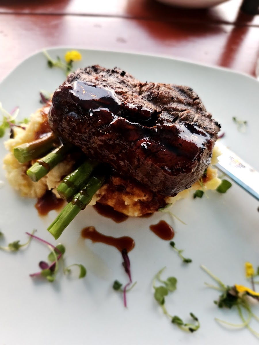 Absolutely delicious steak, baked brie and cocktails. Our server was very nice and offered us a different table with an umbrella for a little shelter from the elements. Great evening