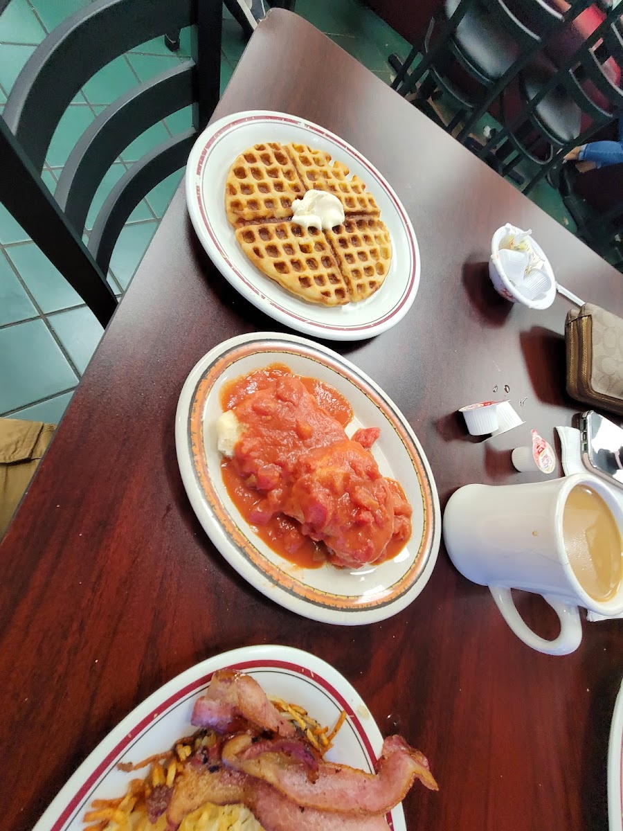 We were pleasantly surprised by the quality of food here! Totally trumps that other waffle place. Eggs were yummy. Country Fried Steak with gravy delicious. Waffle was sweet and French toast was good. We will be back to taste more.