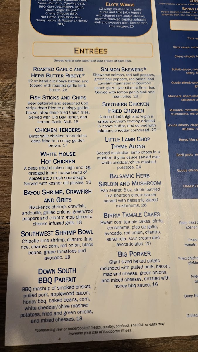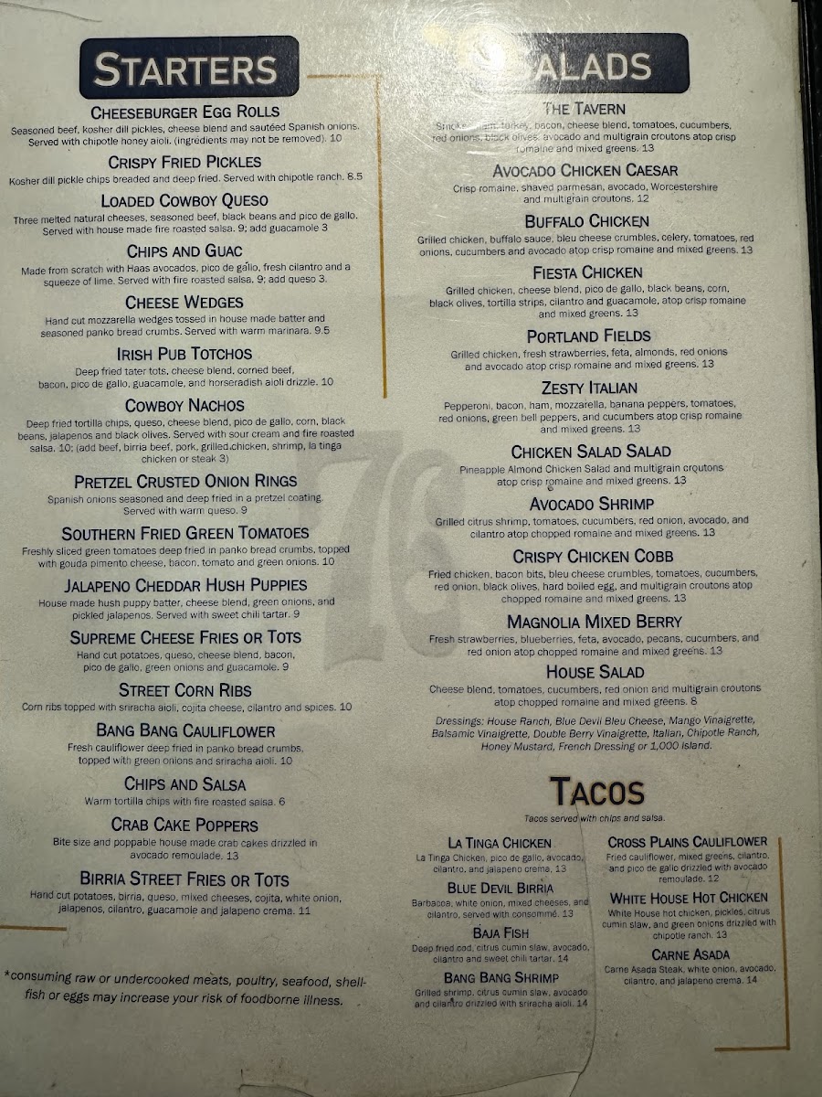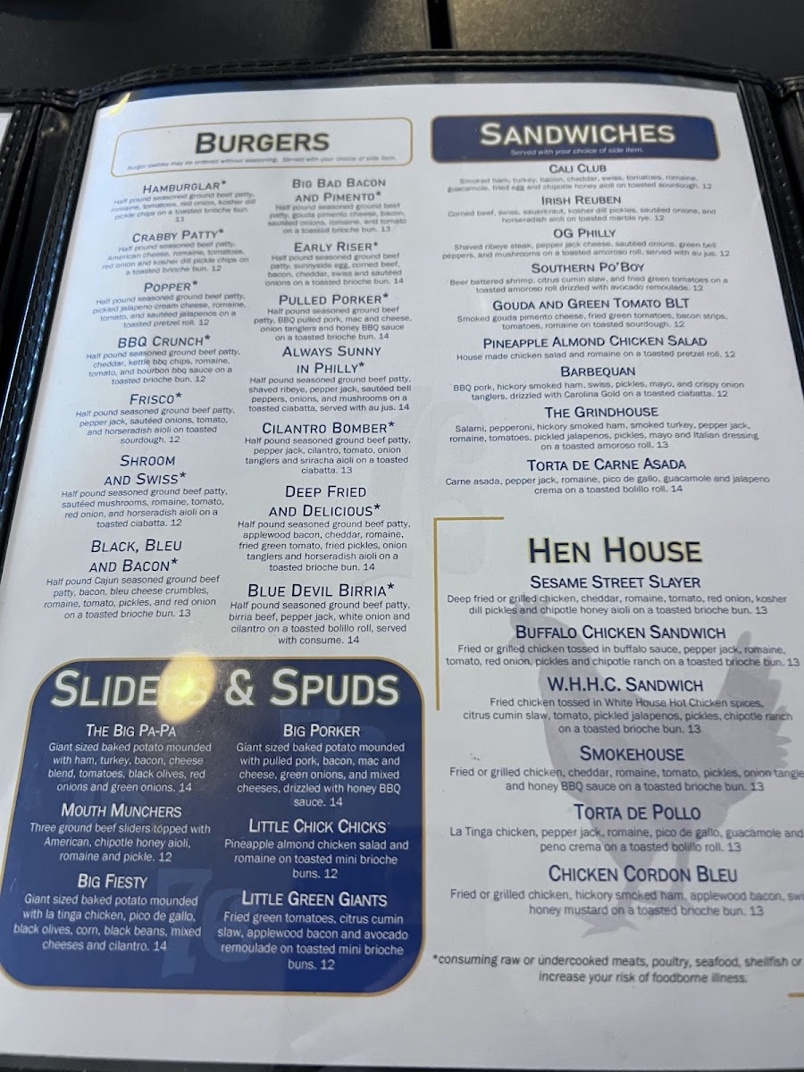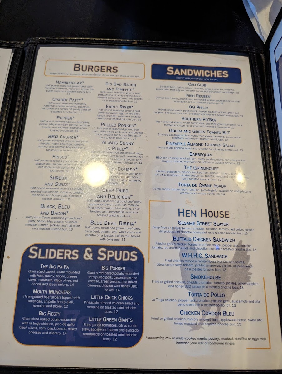 Seasoned ground chuck patty, applewood bacon, sharp white cheddar, mixed greens, fried green tomato, fried pickles, onion tanglers and horseradish aioli on a toasted brioche bun. *Consuming raw or undercooked meats, poultry, seafood, shellfish or eggs may increase your risk of foodborne illness.