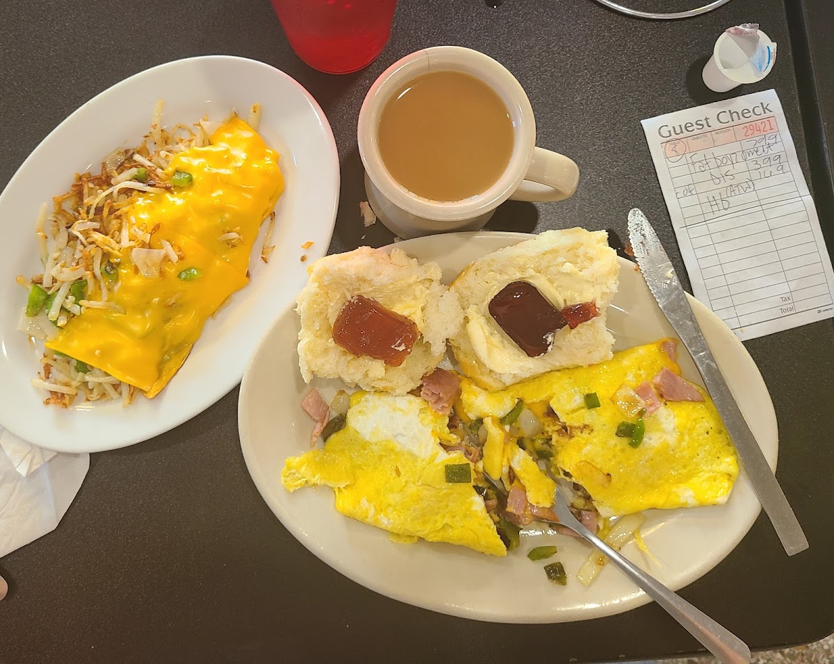 Had the omelet with cheese, onions n peppers n hashbrowns with the same 3 plus a light n fluffy biscuit. Staff were busy, but very friendly fast and friendly! Food was hot n served fast. I'll be back, wish they offered breakfast all day! Room is nicely decorated n roomy but sound bounces all around.