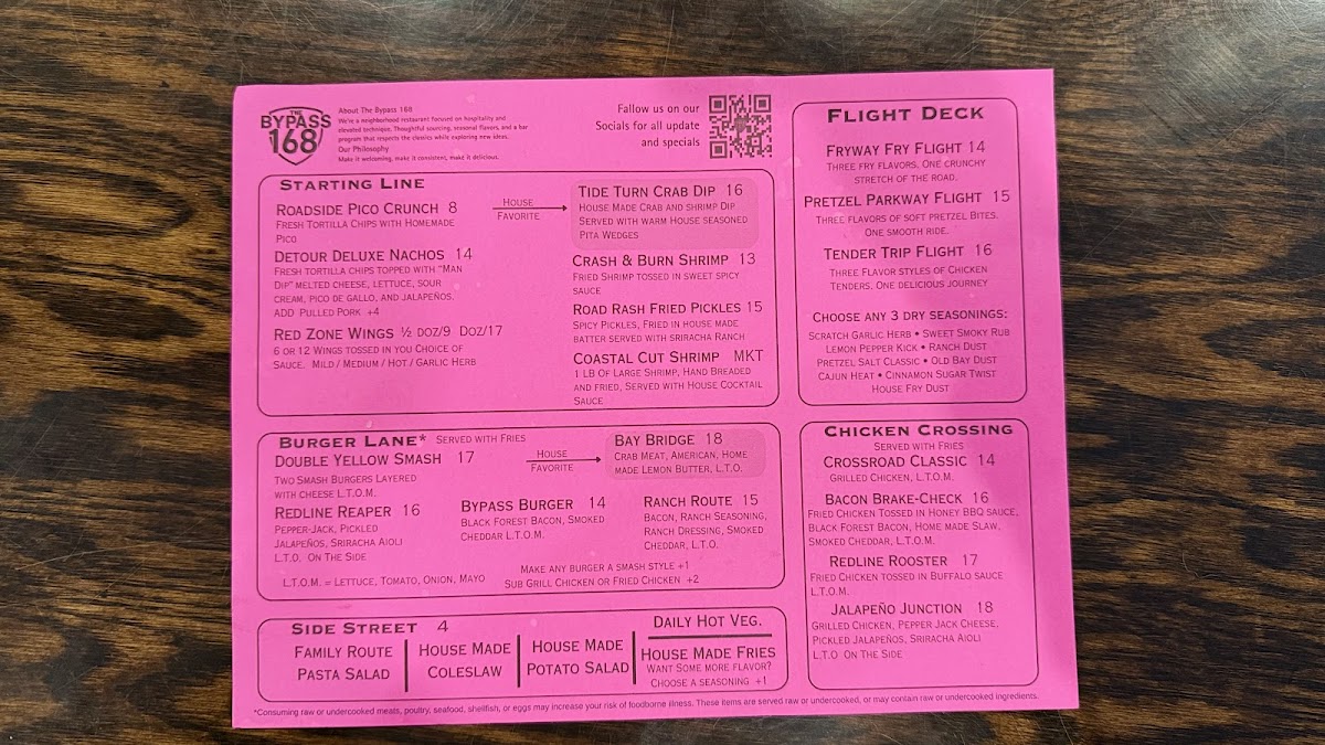 The Bypass 168 is an American restaurant at 237 Carmichael Way, Chesapeake, VA 23322, United States. It has earned 384 user reviews and serves a broad menu. Featured dishes include Burger, Old Bay Wings, Shrimp Route Tacos, and Caesar Salad, providing a range of classic American eats in a lively setting.