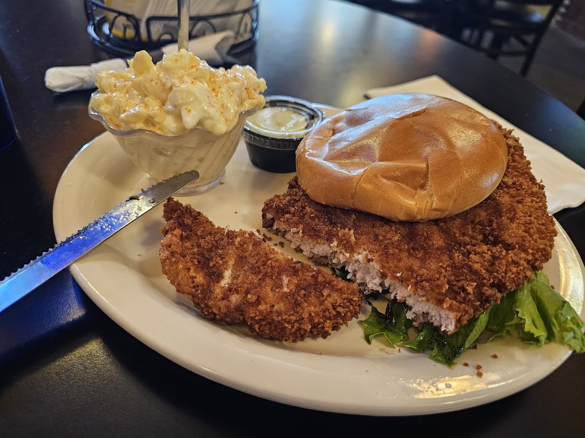 Great Tenderloin sandwich. The Pub at Pinicon in New Hampton Iowa. A nice thick piece of pork with a light and crispy breading. Nice and moist perfectly cooked. $15. The potatoes salad was amazing! Nice and crGreat Tenderloin sandwich. The Pub at Pinicon in New Hampton Iowa. A nice thick piece of pork with a light and crispy breading. Nice and moist perfectly cooked. $15. The potatoes salad was amazing! Nice and creamy very light egg. Bits of celery and mild onion gave a very nice crunch. Even the pickles separate were excellent. Great atmosphere and very nice service. And they won't give the potato salad recipe.eamy very light egg. Bits of celery and mild onion gave a very nice crunch. Even the pickles separate were excellent. Great atmosphere and very nice service. And they won't give the potato salad recipe.