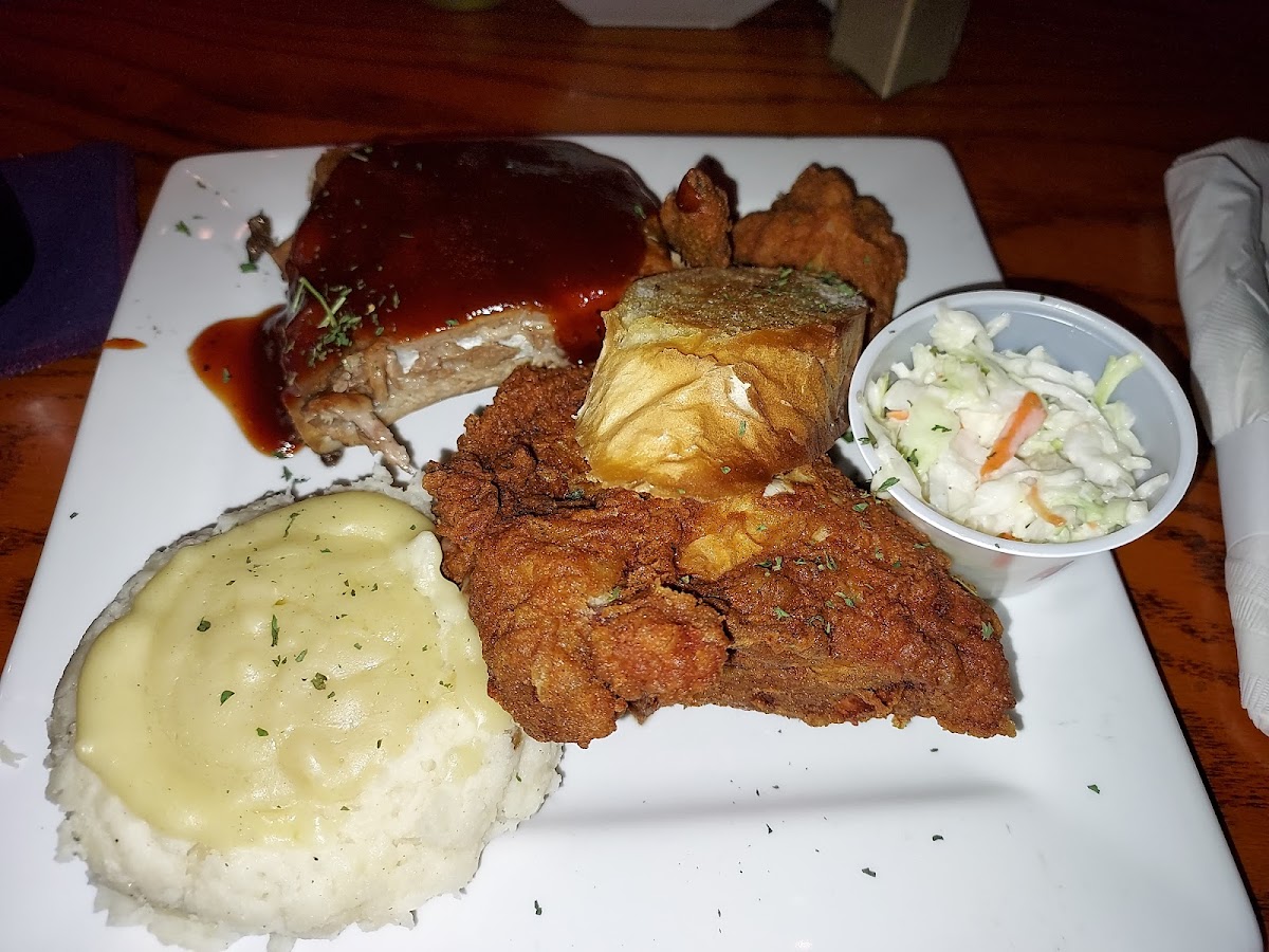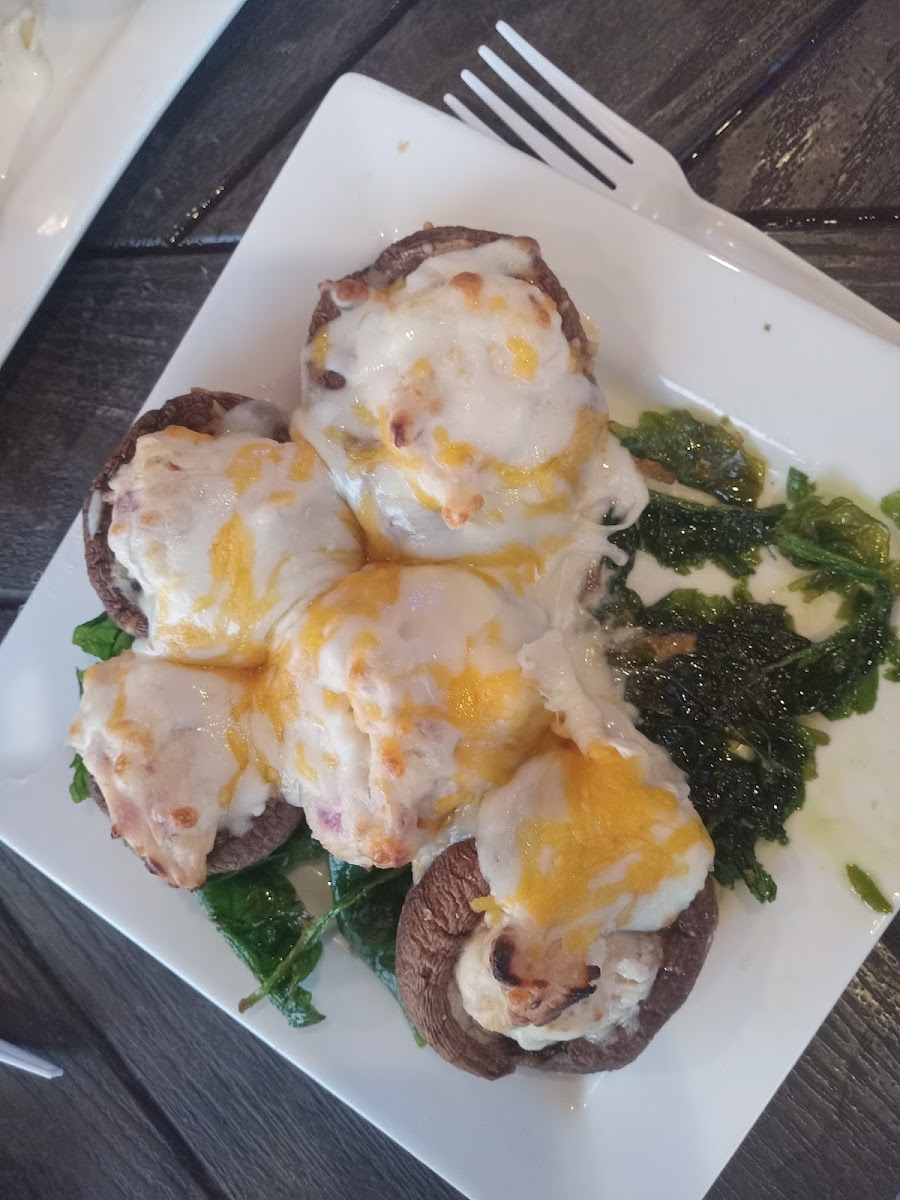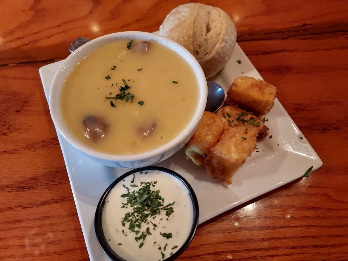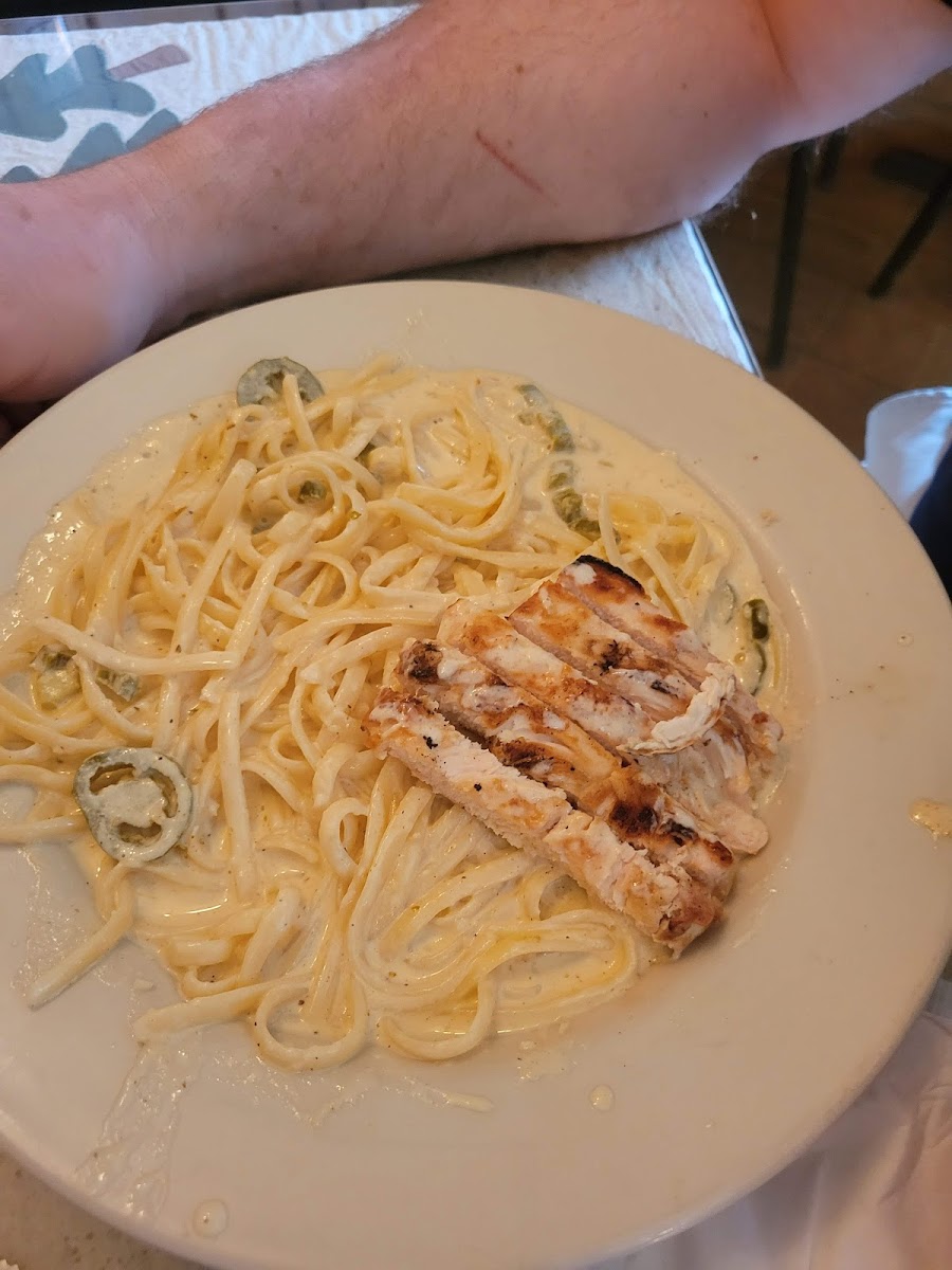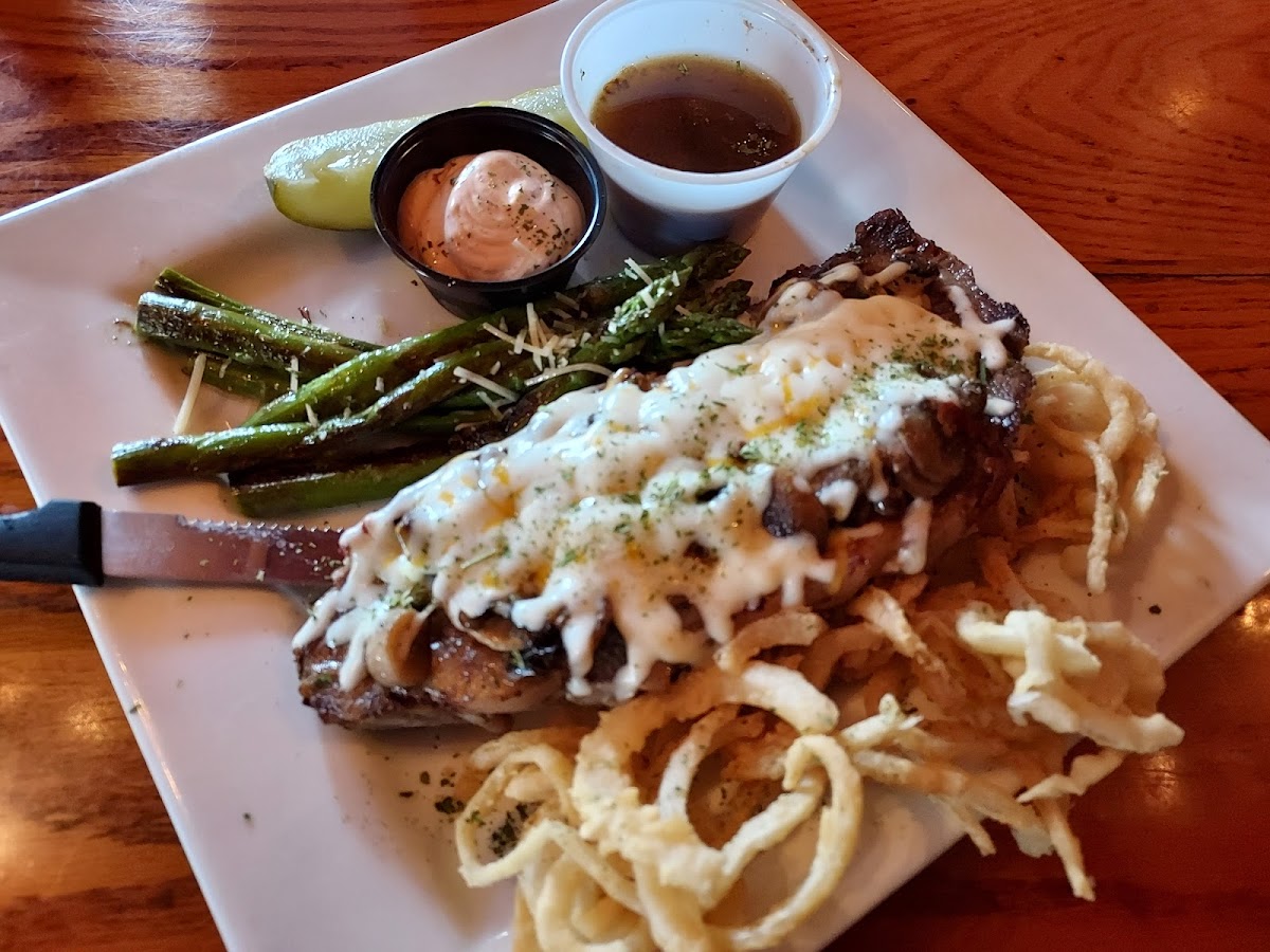 First time customers- good atmosphere, music is not so loud that you couldn't have a talk over dinner. The food was good. Had the ribeye and baked potato and my husband had the Alfredo pasta with Cajun chicken. My husbands only complaint was his pasta could be warmer. Tried their homemade cheese curds. They were good and not sopping wet with grease and not overly battered. Waitresses were attentive and kept the drinks refilled but they were working their butt off. Went to the bathroom and initially I found it to be decent and clean. I had a little trouble getting the door lock to line up to lock. I found the bathroom floor to be sticky but no debris, but a clean toilet and clean solid seat. Can't wait to return to try out some other dishes.