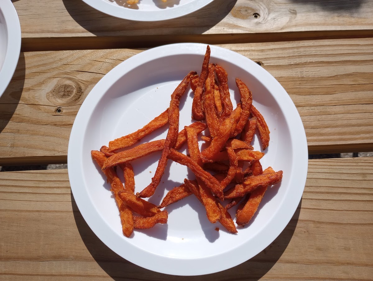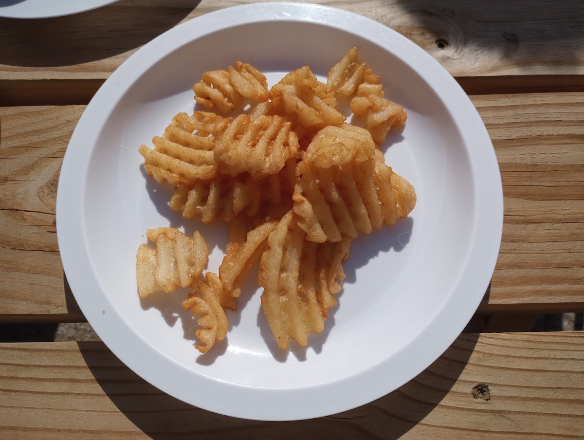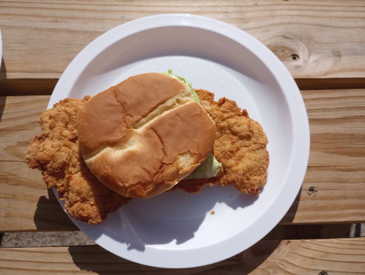 breaded tenderloin was very good had a nice pork to breading ratio. could have used a little seasoning. good quality pork no fat or gristle. the grilled tenderloin was also good though did have a bit of beef aroma from the grill. waffle fries needed more time in the fryer but still very potatoey. sweet potato fries were nice and crispy. extra points because there was no styrofoam. everything was wrapped in compostable paper.