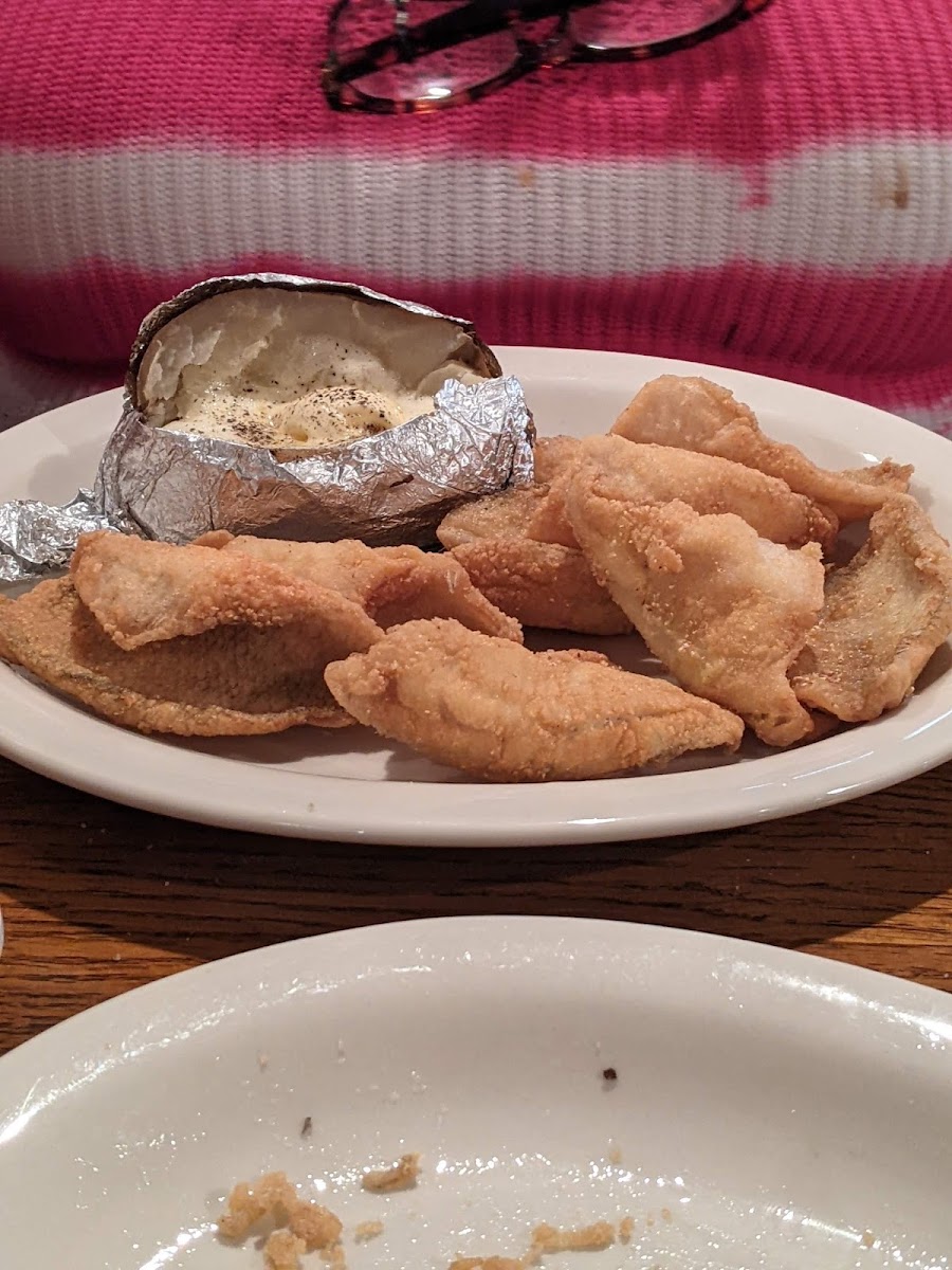 The service was excellent. Overall, the food was good, but the blue gill was greasy and the pieces were very thin. Also, the sour cream was in paper cups, which absorbed the moisture and made it hard to get the sour cream out.