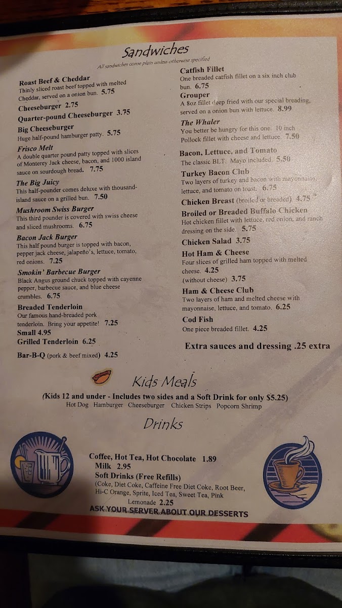 Coke, Diet Coke, Caffeine Free Diet Coke, Root Beer, Hi-C Orange, Sprite, Iced Tea, Pink Lemonade