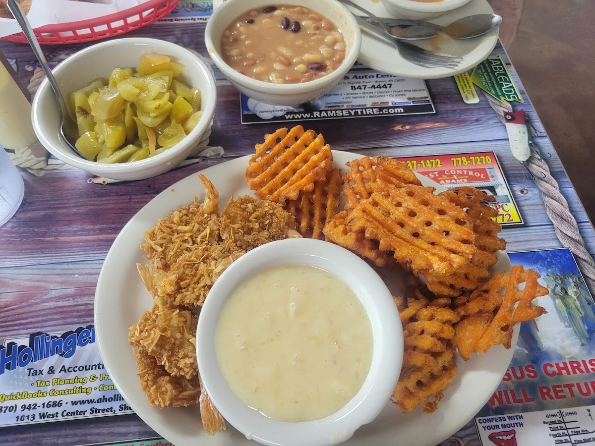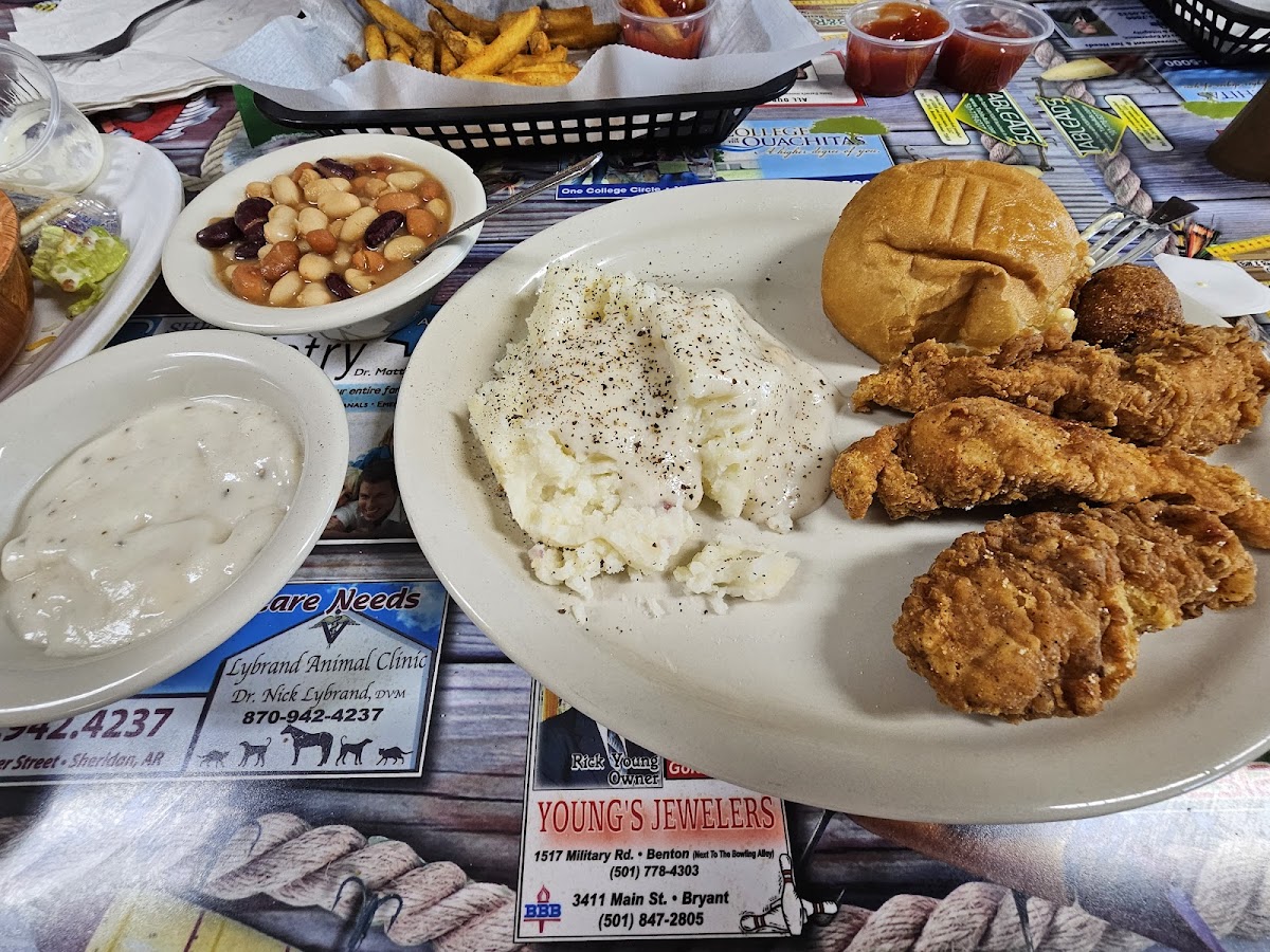 Love this Country Restaurant in Prattsville Arkansas Called the Whippet Restaurant they never disappoint you fresh Food and Great Service went to visit on Saturday Afternoon wasn’t too busy I ordered 2 piece Catfish meal they gave me 3 Baked Potato, Beans, Coleslaw, Green Tomato relish and Hush Puppies everything was perfectly cooked served hot would definitely recommend if you haven’t tried it Also closed on Sunday and Monday