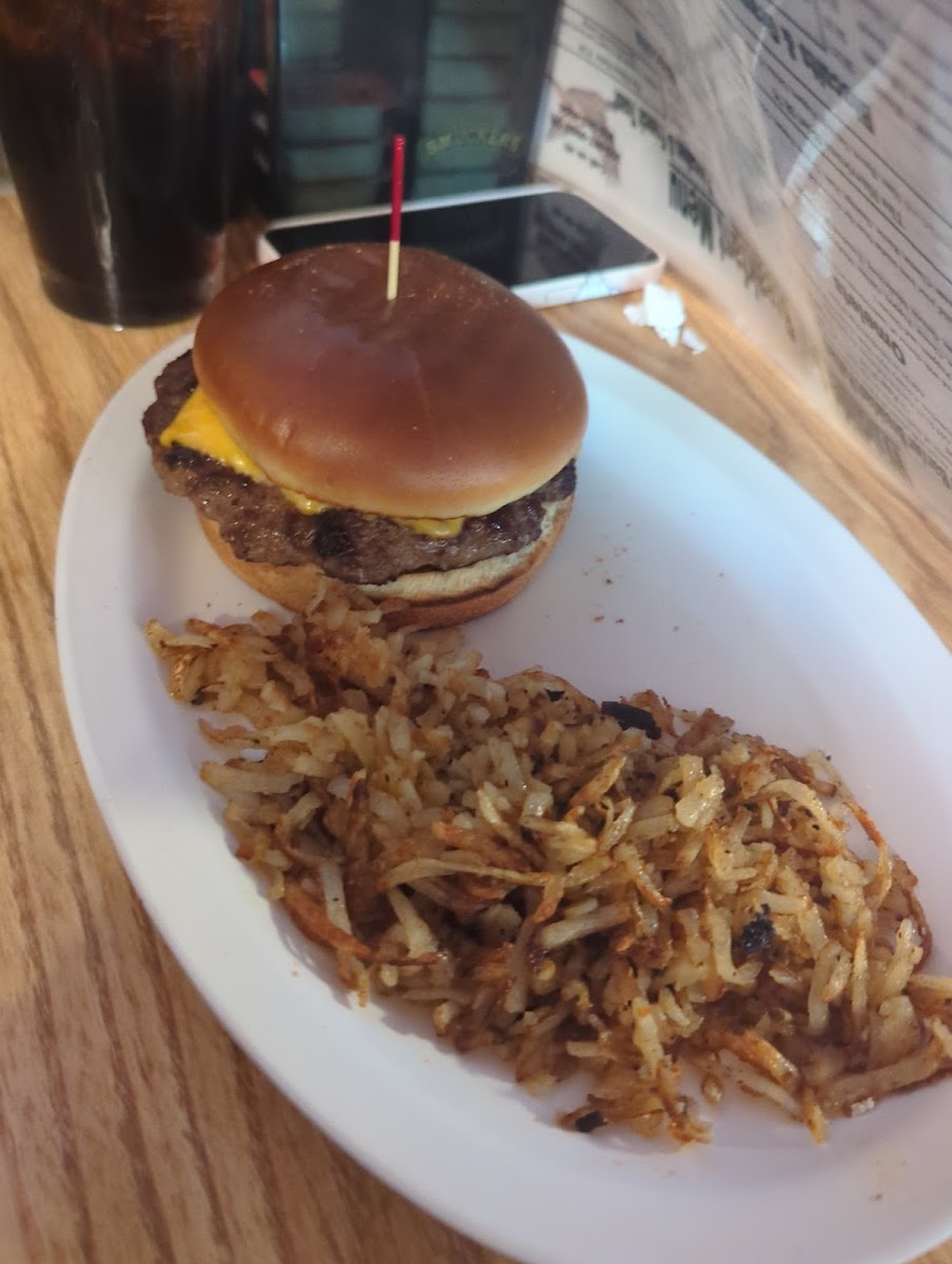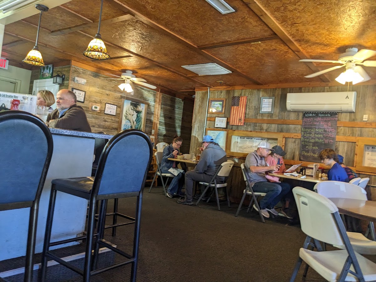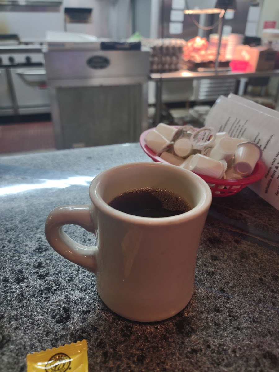 Oh wow. What a deal on breakfast. $ 3.95 for 2 perfectly cooked over easy eggs, 2 big delicious pancakes, and bacon or sausage. Bottomless coffee. Hoping to make it back for the fried chicken special later.