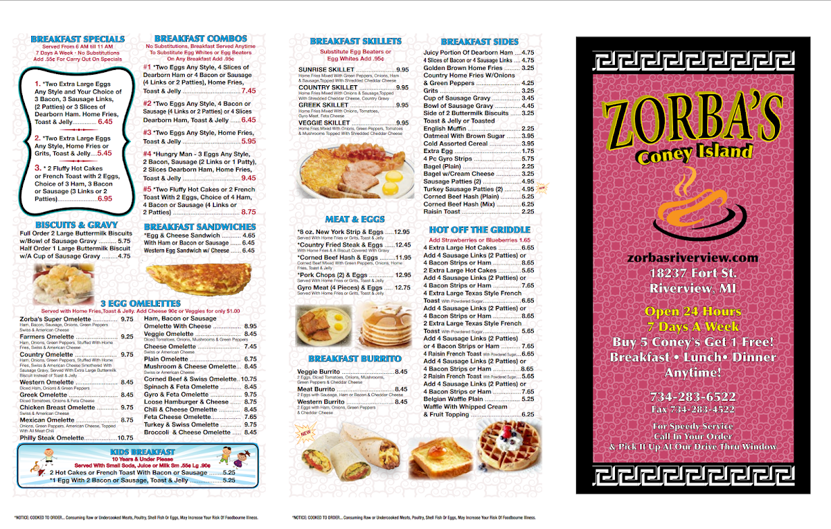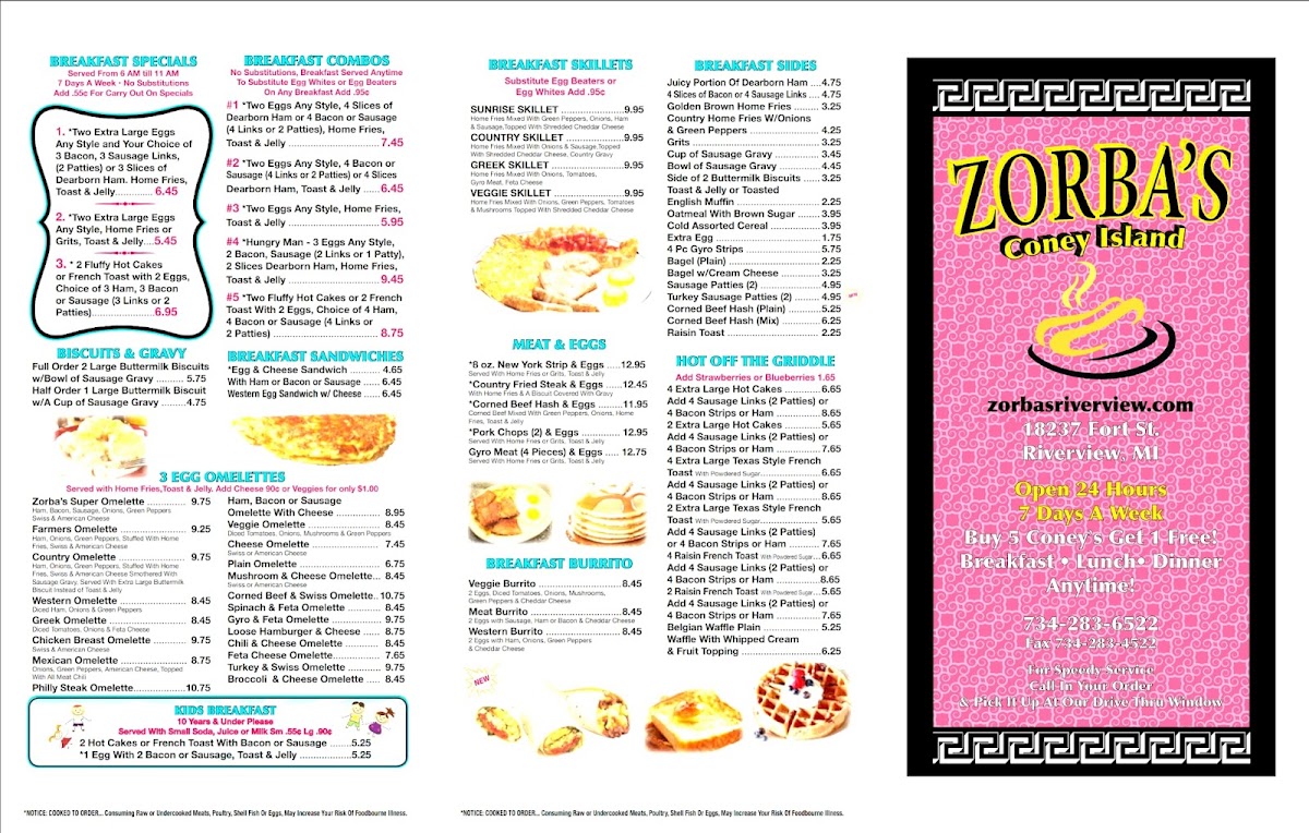 Served With Home Fries or Grits, Toast & Jelly. Notice: Cooked to order. Consuming Raw or Undercooked Meats, Poultry, Sinell Fish Or Eggs, May Increase Your Risk Of Foodborne illness.