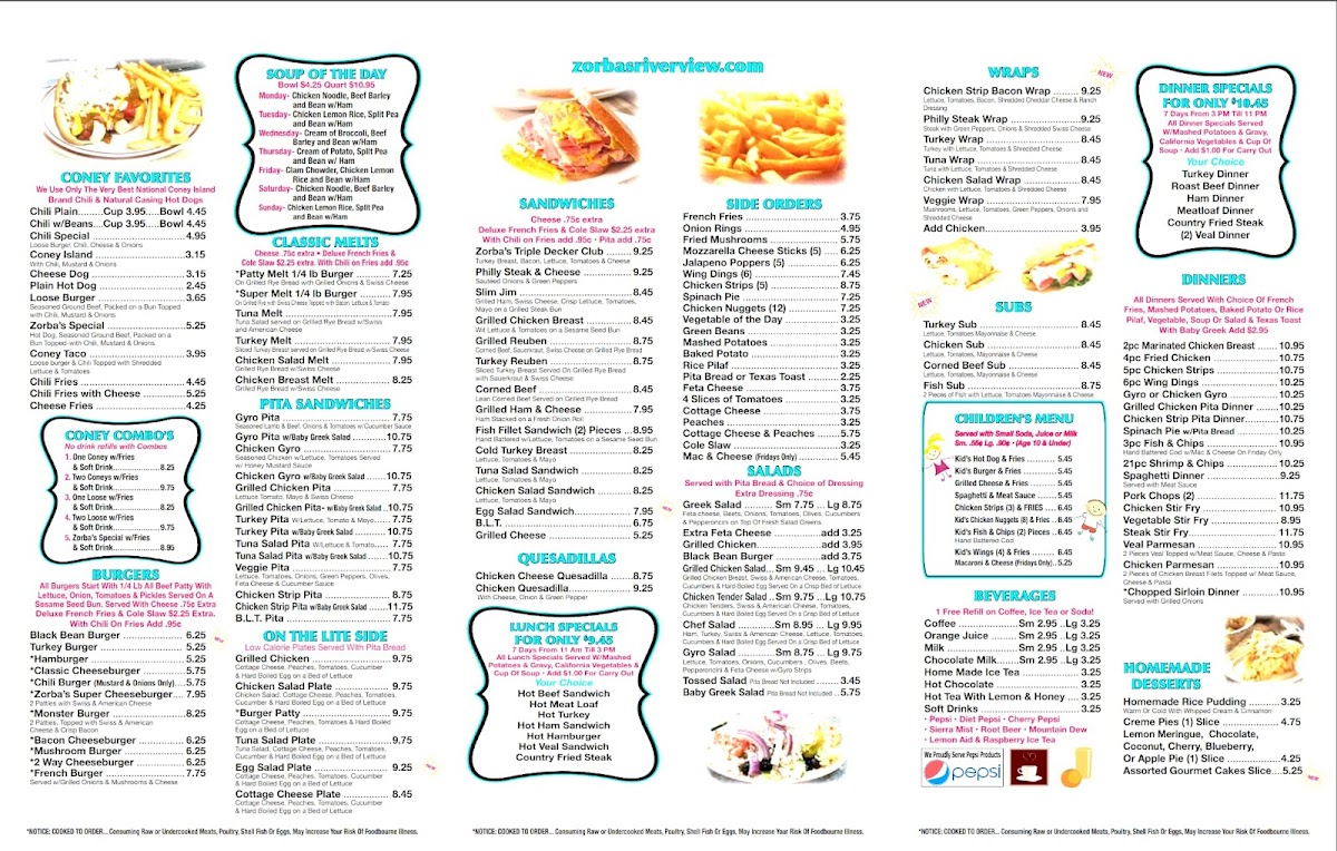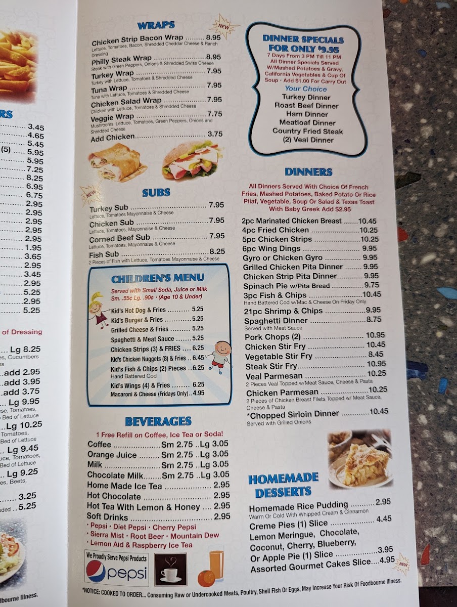 Pepsi, Diet Pepsi, Cherry Pepsi, Sierra Mist, Root Beer, Mountain Dew, Lemon Aid, Raspberry Ice Tea