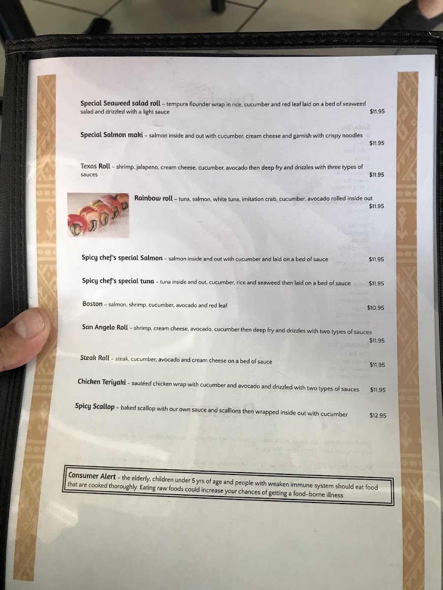 Spicier than the regular spicy tuna. It has tuna inside and out with cucumber and laid on a bed of sauce with noodles as garnish.