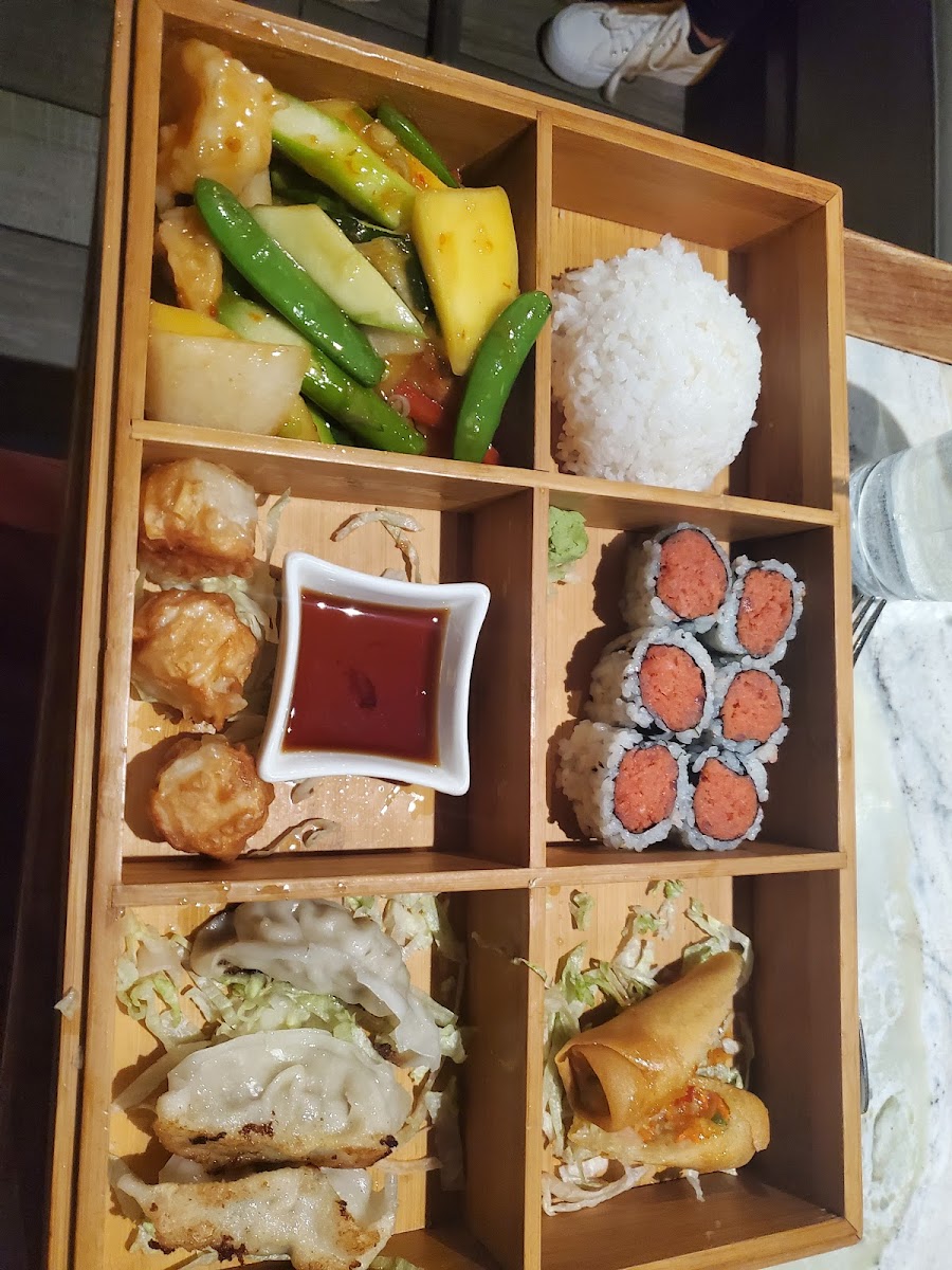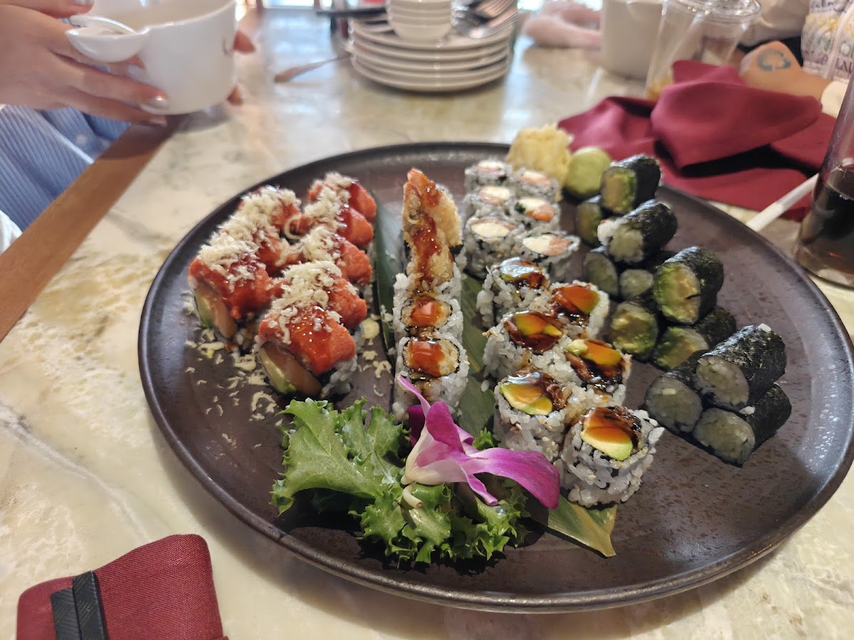 Food was good, but there were limited vegetarian options. The menu did not distinguish what dishes were vegetarian, and a lot of dishes that looked vegetarian actually had a sauce that wasn’t. For starters, we ordered sweet potato sushi, vegetable sushi, and Indian pancake. Then we ordered a red curry, a vegetable wok, and a basic fried rice. Overall food tasted good and service was ok.