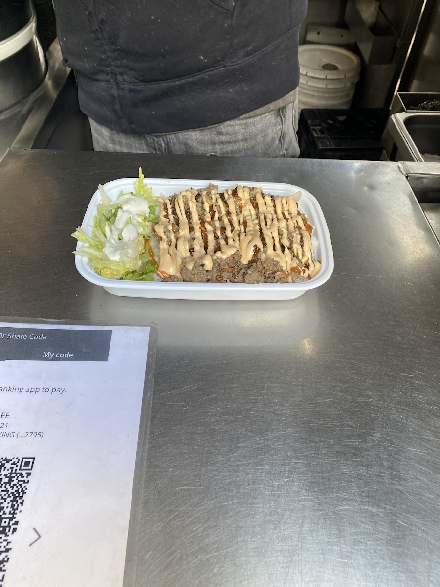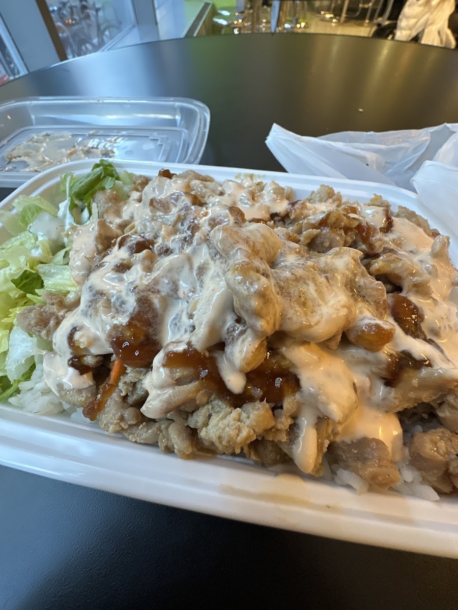 Good food at a decent price. It’s a food cart so service is quick. They allow small modifications like removing a sauce or the salad. Only thing I can complain about is a small bone in the chicken at peak hours and a subpar workflow where if there’s a lot of people they’ll make 3-4 orders before anybody can get their food.