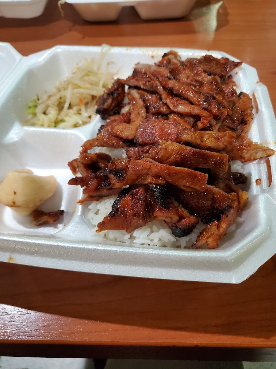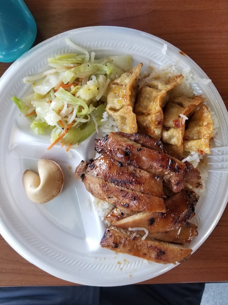 Food tasted good, expensive for precooked ready to go food paid 45 for two plates and a kids meal. The "steamed veggies" was a tiny salad with a couple pieces of raw broccoli and dressing. Took not even 5 minutes from the time I ordered til the time they handed me the food. Tasted good tho!