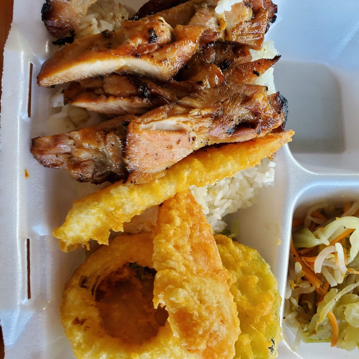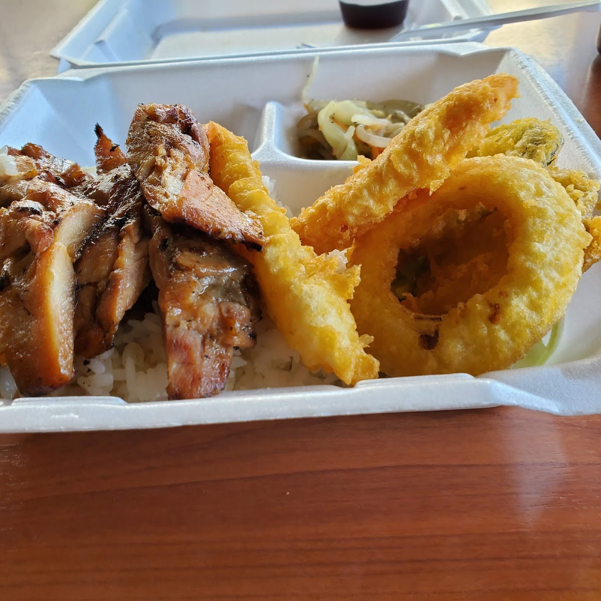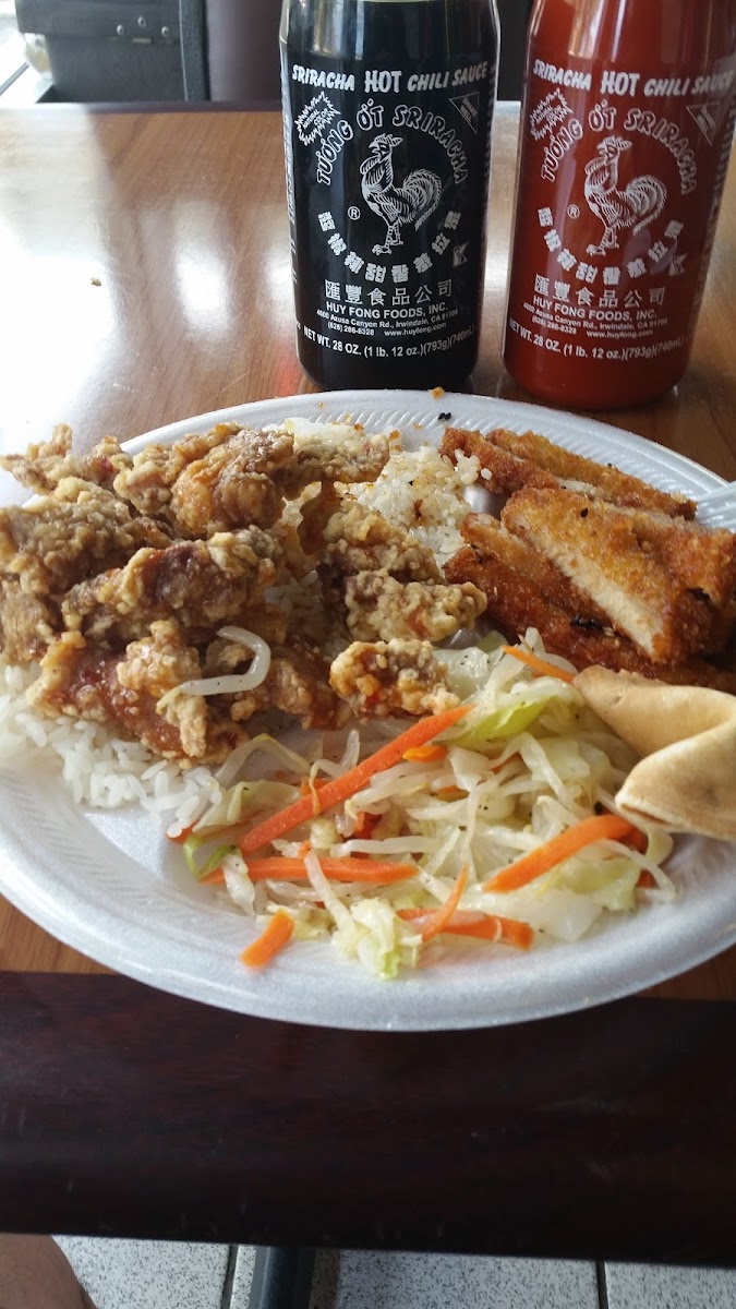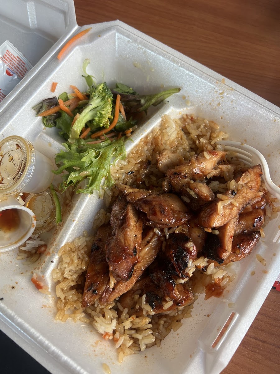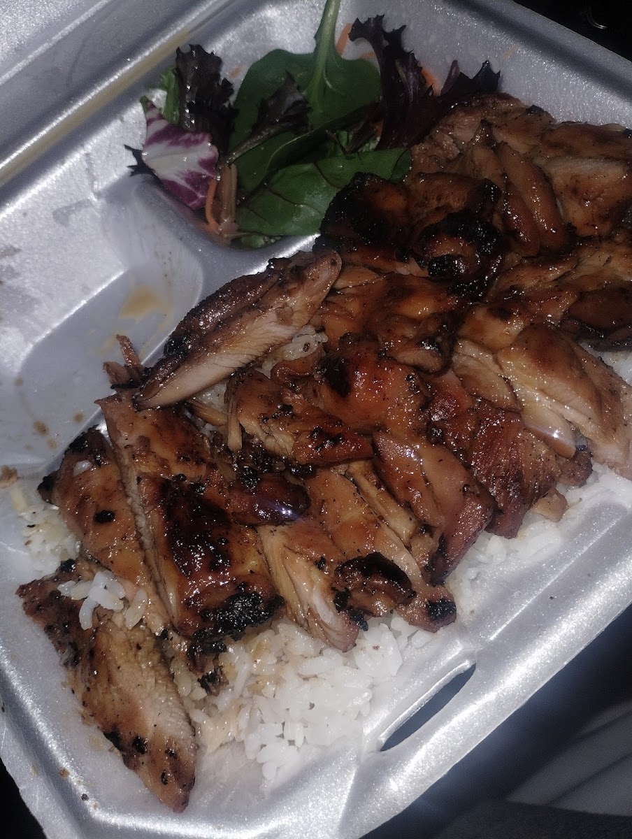 Sometimes We just love simple, great Teriyaki Chicken, over white rice with their "vegies salad". WE each " Doctor" Our way at home. LOL GF Organic Tamari, and Honey & Pineapple Teriyaki added. YUM!