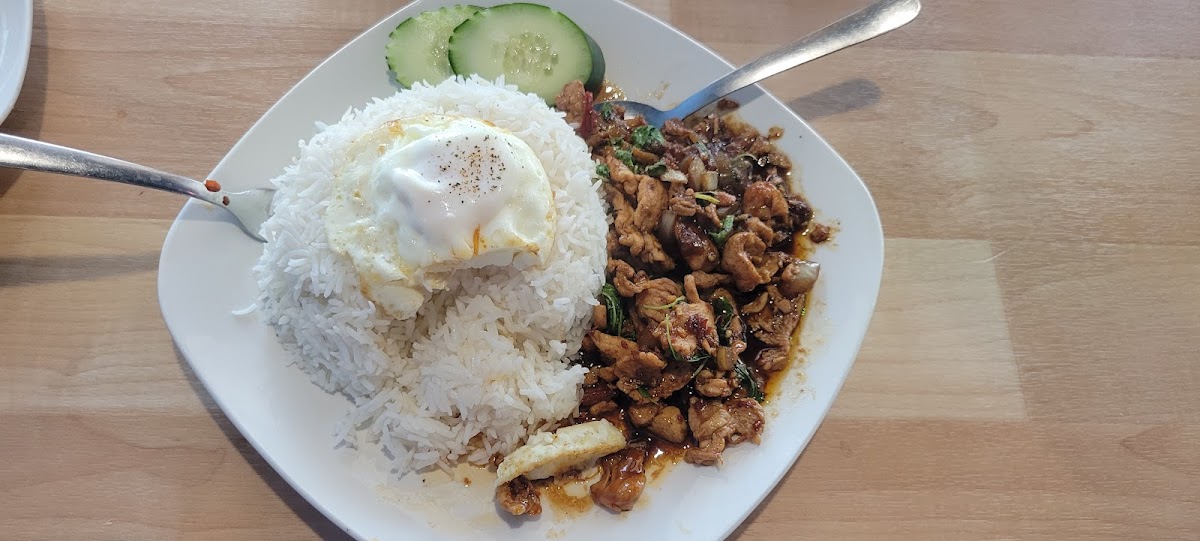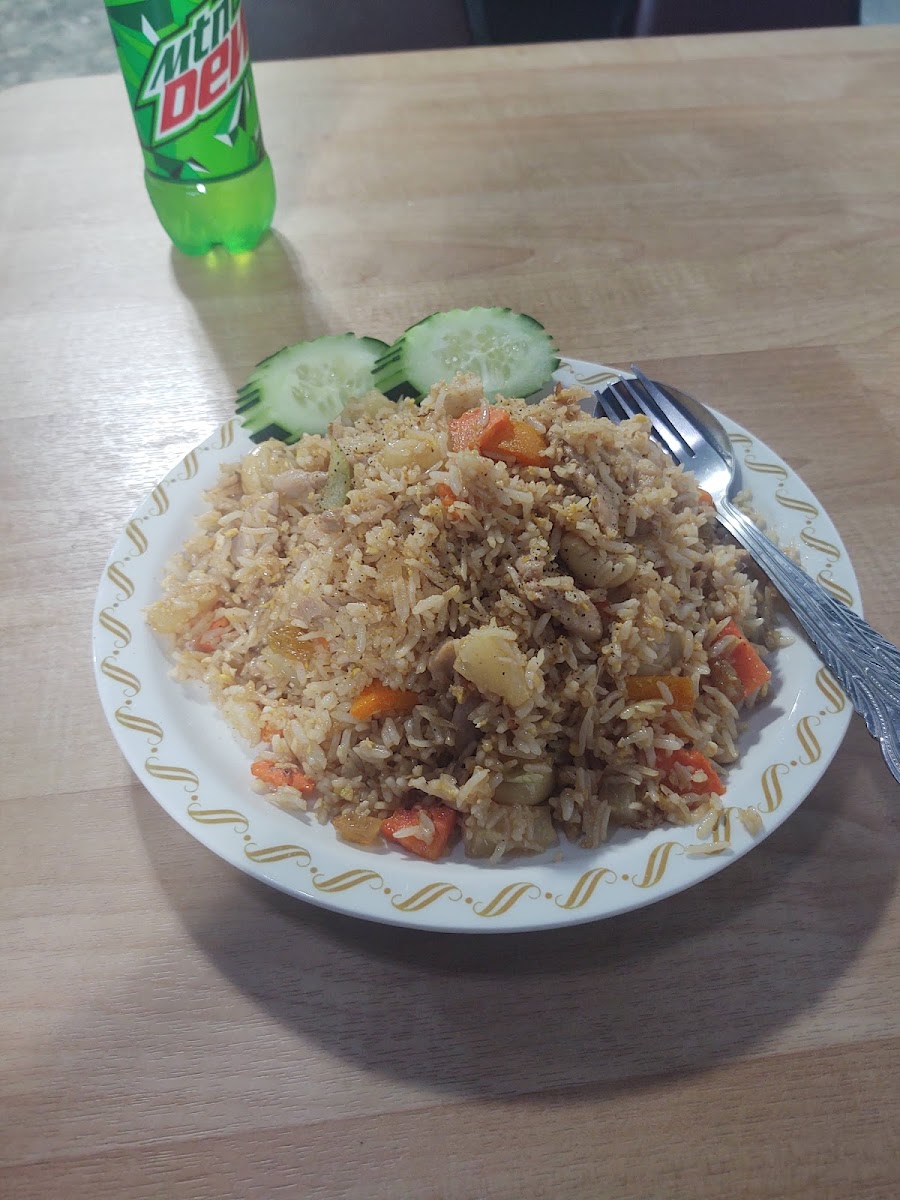 Pretty good fried rice. Good meal size than the price. The menu has pictures of the food. They have a small bakery that looks a side hustle. They also have coffee. There's room for 40 people according to the sign. Probably not a lot halal Thai places in Fort Wayne. They also have coffee. I would go back it's a good place on South side of town. It has a parking lot next to the building. Close to luers